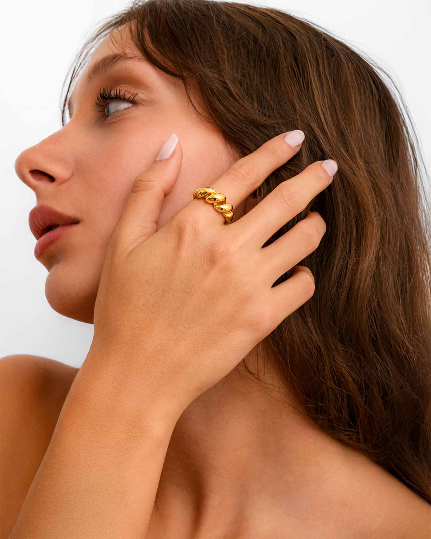 Bold, luminoso, inconfondibile. Questo anello presenta volumi pieni ed è pensato per chi ama i gioielli che non passano inosservati. Una presenza forte, che parla di carattere prima ancora che di stile.