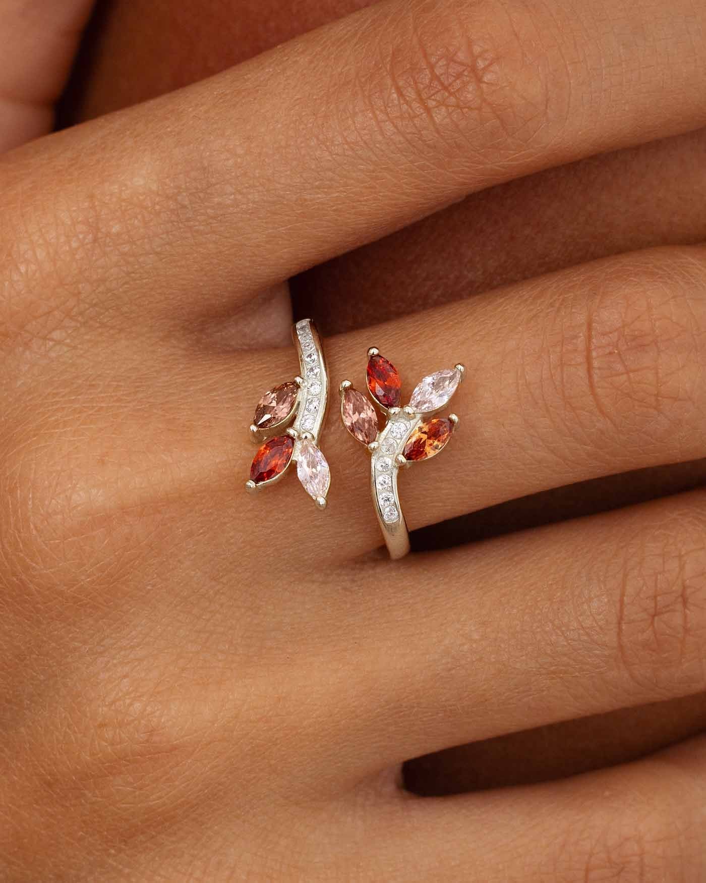 L’Anello Foliage avvolge delicatamente il dito con il suo design armonioso. La struttura sinuosa richiama un piccolo ramo, arricchito da pietre dal taglio marquise che simulano, nella forma e nei colori, le foglie autunnali. A illuminare il tutto, una fila di piccoli punti luce bianchi incastonati lungo la fascia.