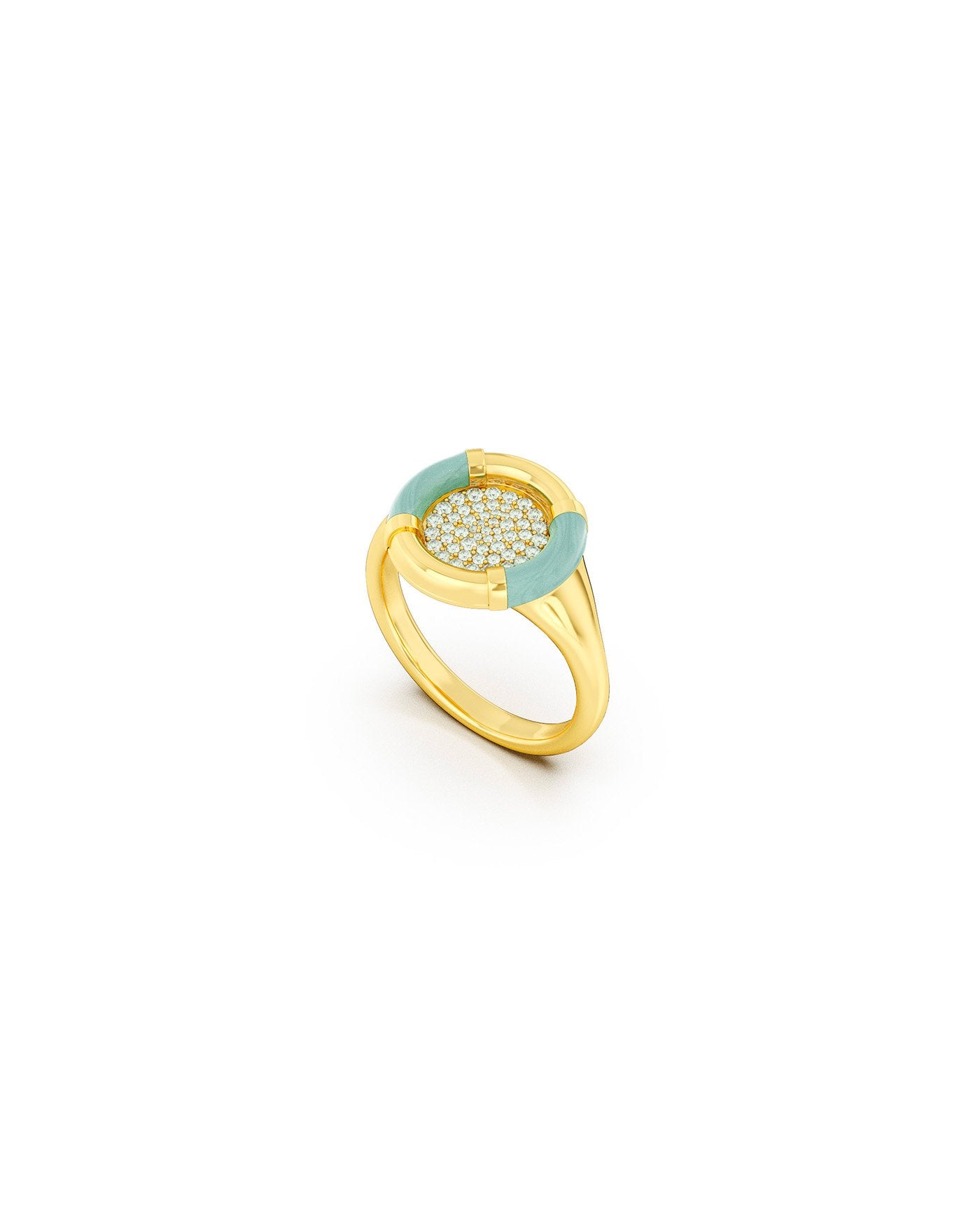 Un anello che racconta una storia di contrasti armoniosi: il pavé di pietre al centro cattura la luce come un piccolo mosaico, mentre i dettagli smaltati ai bordi ne addolciscono i contorni. Ha il fascino di un gioiello ritrovato in un baule di famiglia, ma parla anche al presente, con uno stile che unisce eleganza retrò e freschezza contemporanea. Un compagno discreto ma distintivo, fatto per chi ama portare con sé un’aura vintage.