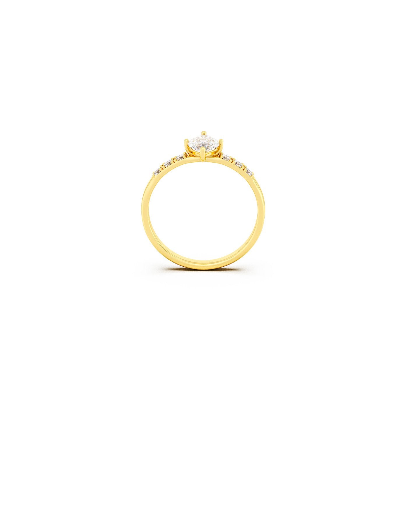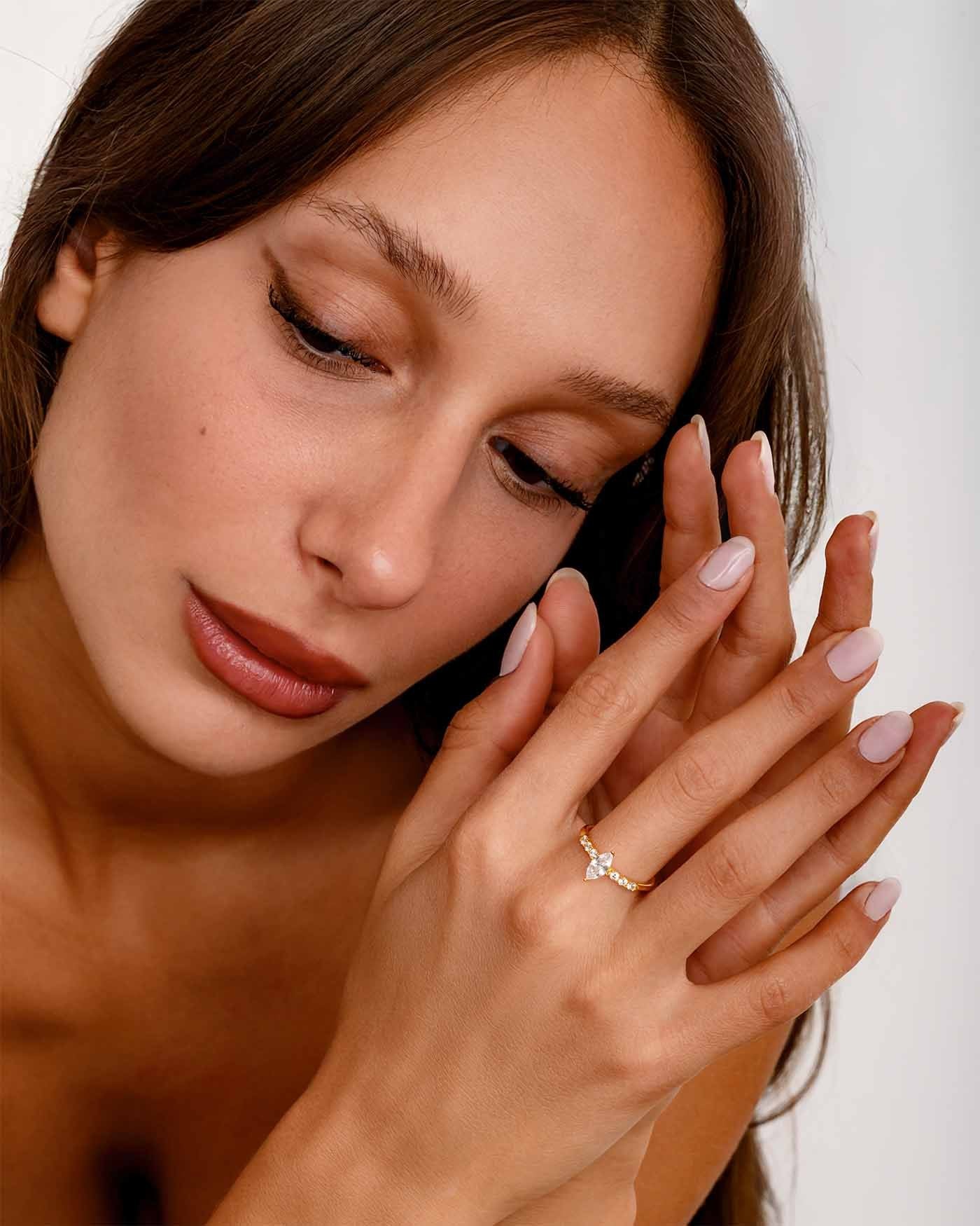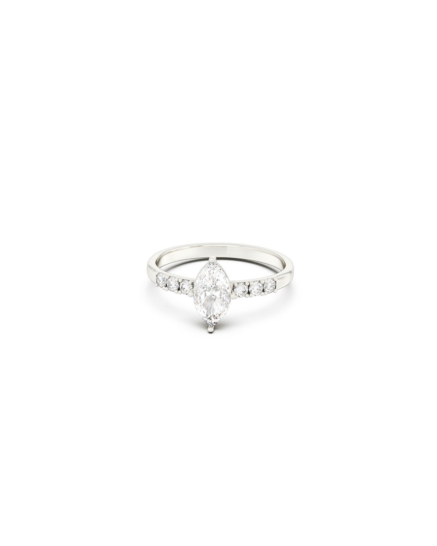 Allure fiabesca e una pietra che fa da protagonista. Glimmer è un anello solitario caratterizzato da una pietra centrale a taglio marquise. La sua luminosità estrema è data anche dai piccoli punti luce che impreziosiscono la parte frontale della fascia. Perfetto da indossare come protagonista assoluto o in abbinamento con altri anelli.