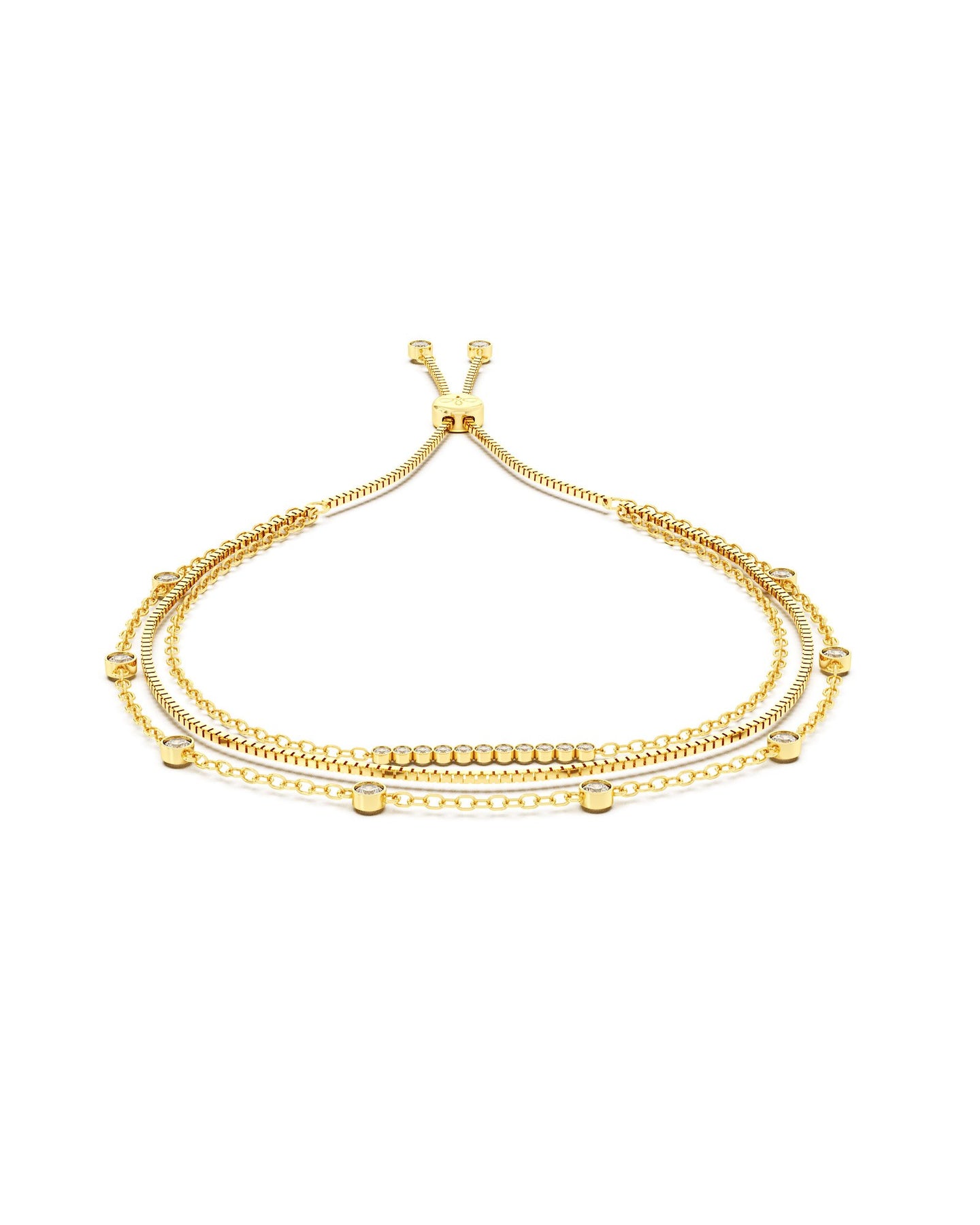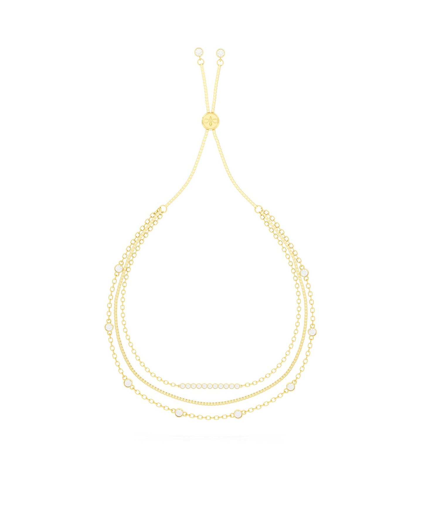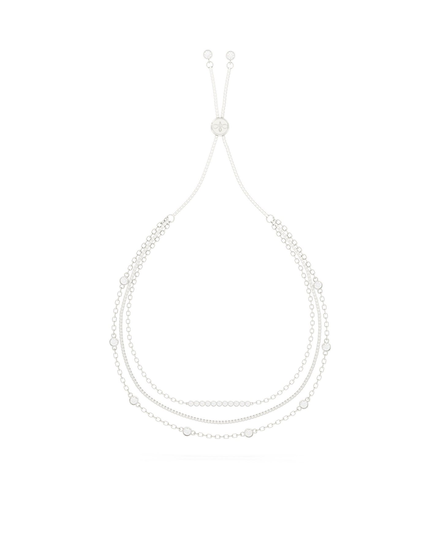 Un unico gioiello che regala l’effetto di tre bracciali sovrapposti. Il Bracciale Dea si compone di tre catene di diverse lunghezze, impreziosite da punti luce bianchi con incastonatura bezel, che donano estrema luminosità. Dotato di pratica chiusura scorrevole, si adatta facilmente a ogni polso, unendo comfort e stile.