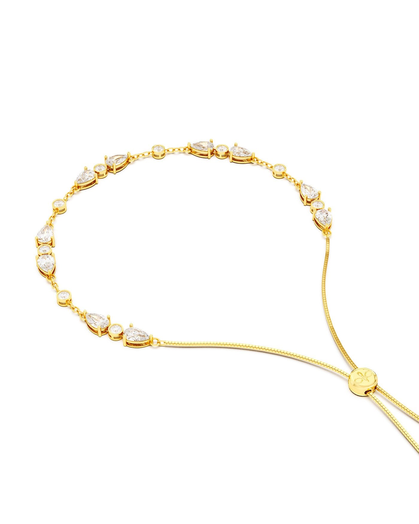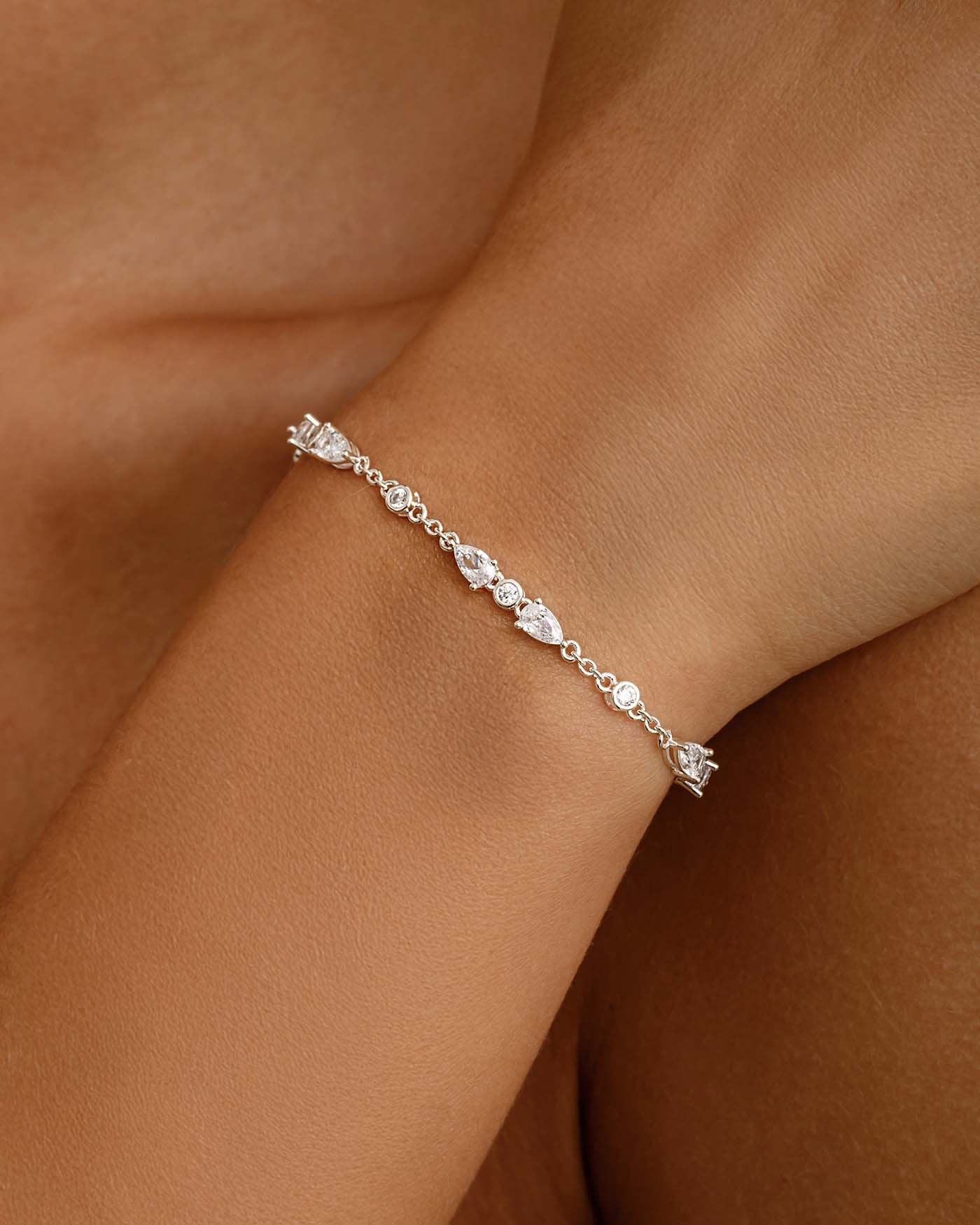 Un bracciale luminoso, perfetto per le occasioni speciali: le pietre, diverse tra loro per taglio e forma, si inseguono creando un ritmo elegante. La chiusura scorrevole regala comfort e perfette di adattarsi con facilità o ogni tipo di polso. Raffinato ma discreto, ha il fascino di quei dettagli che si notano senza bisogno di ostentare, e che restano impressi proprio per la loro semplicità luminosa.