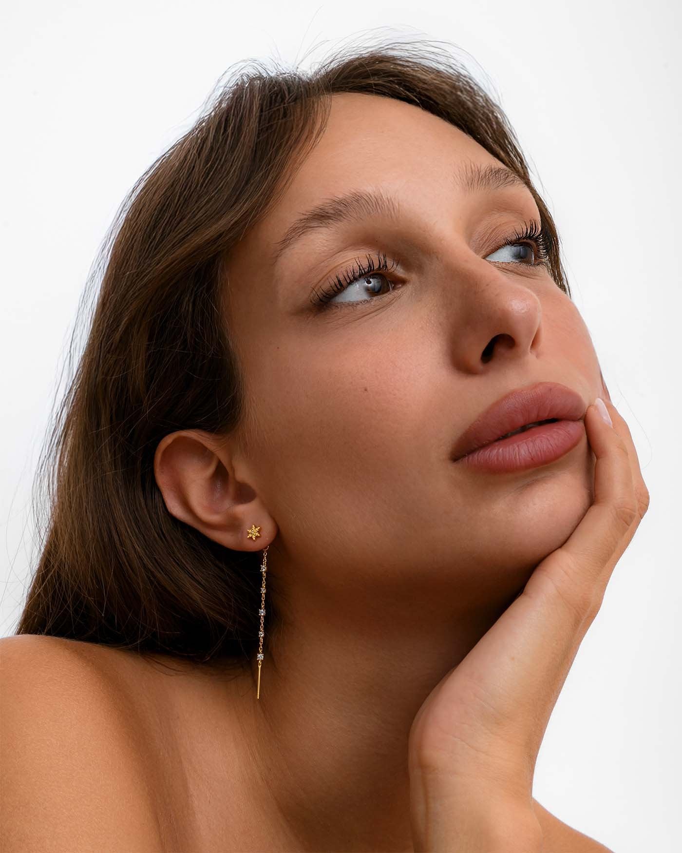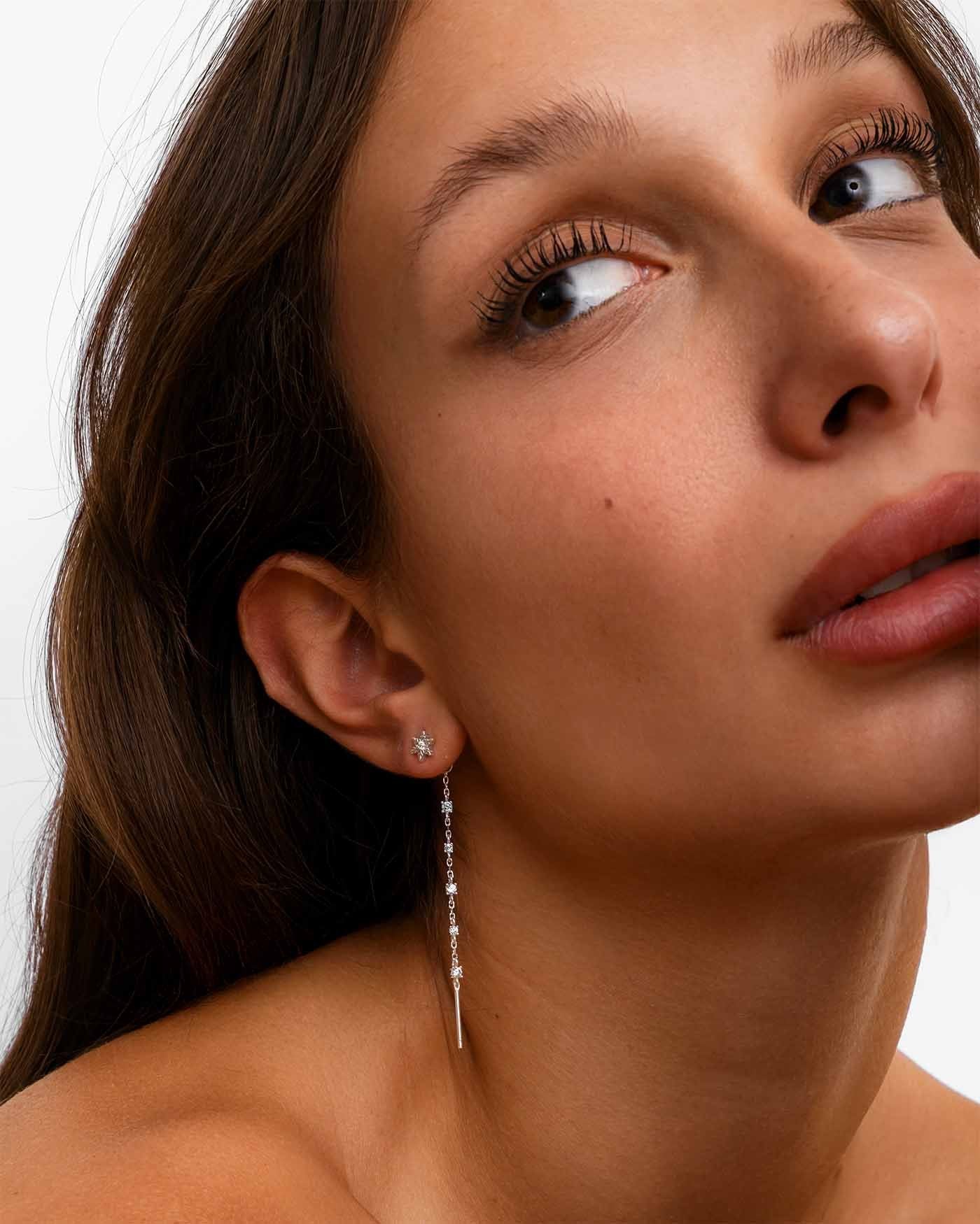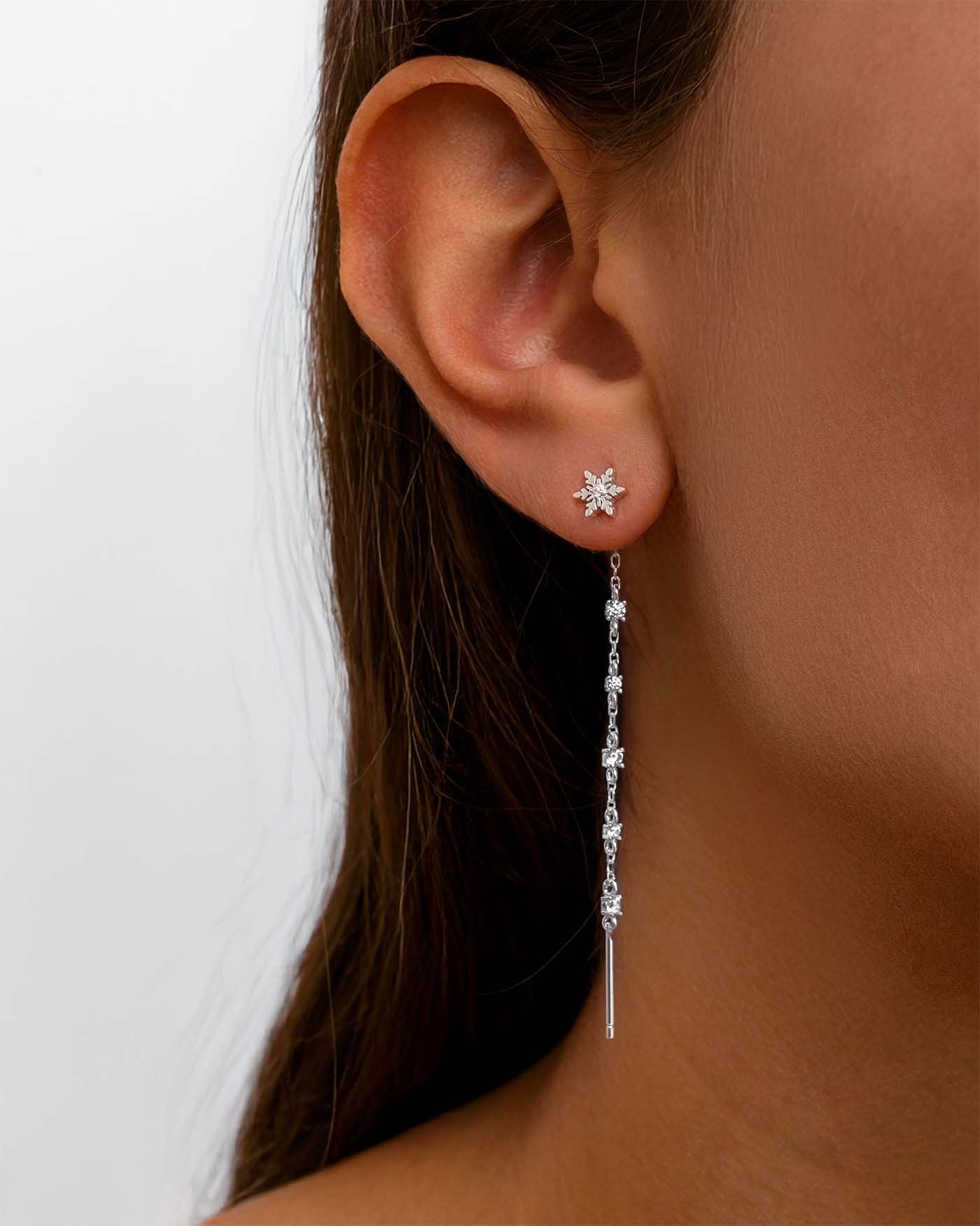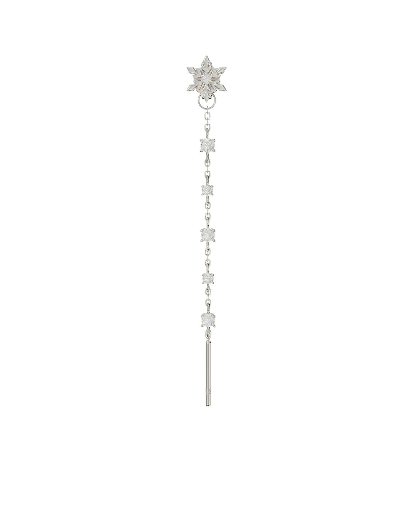 Un orecchino pendente raffinato, decorato con un delicato fiocco di neve e una catenella di pietre bianche in zirconia cubica. La doppia chiusura intercambiabile lo rende unico: con la prima, una cascata luminosa per un effetto elegante e brillante; con la seconda, si trasforma in un semplice orecchino a lobo.