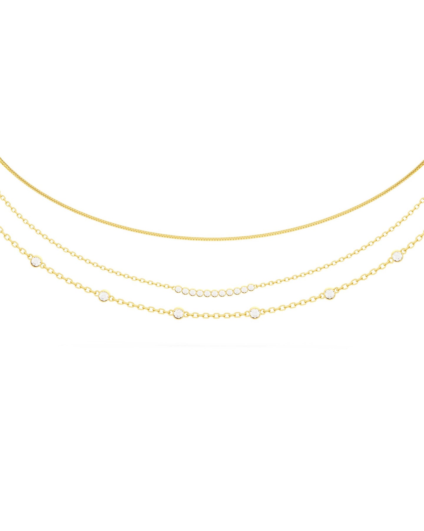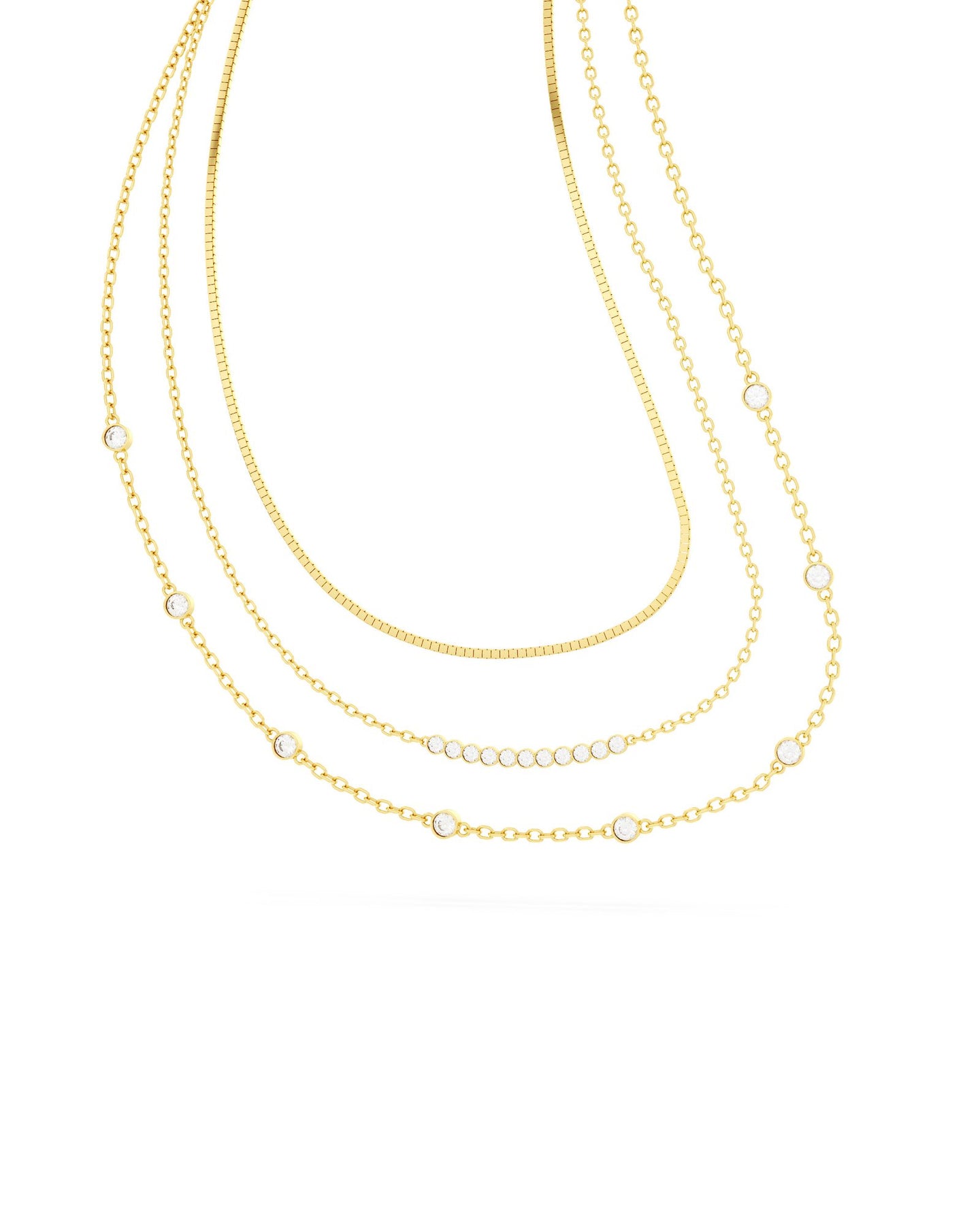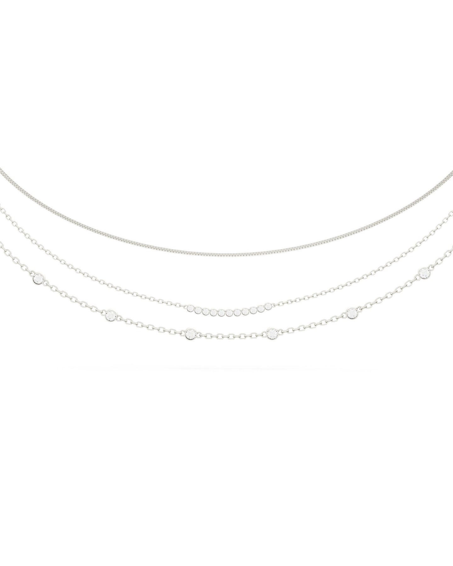 La Collana Dea regala l’effetto pieno, ma raffinato, di tre collane unite in un unico gioiello. Le tre catene di diverse lunghezze sono impreziosite da punti luce bianchi con incastonatura bezel.