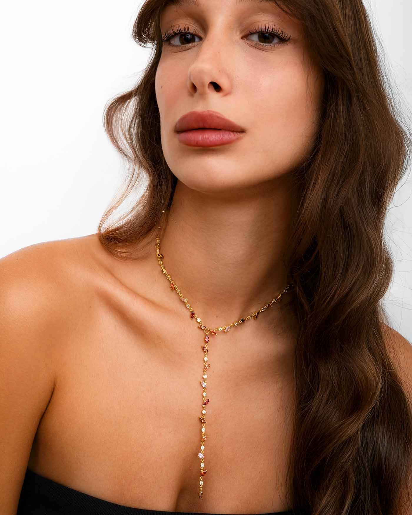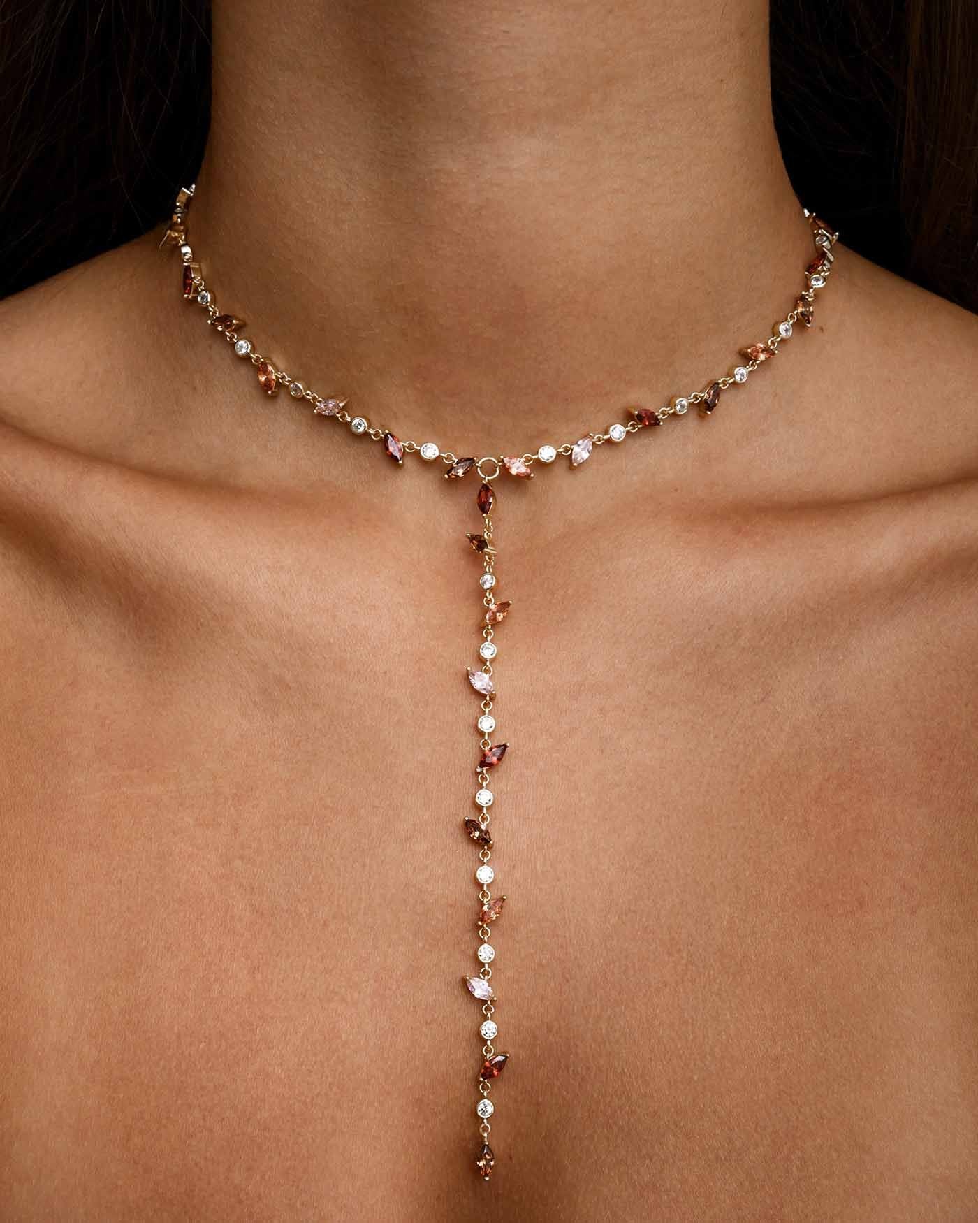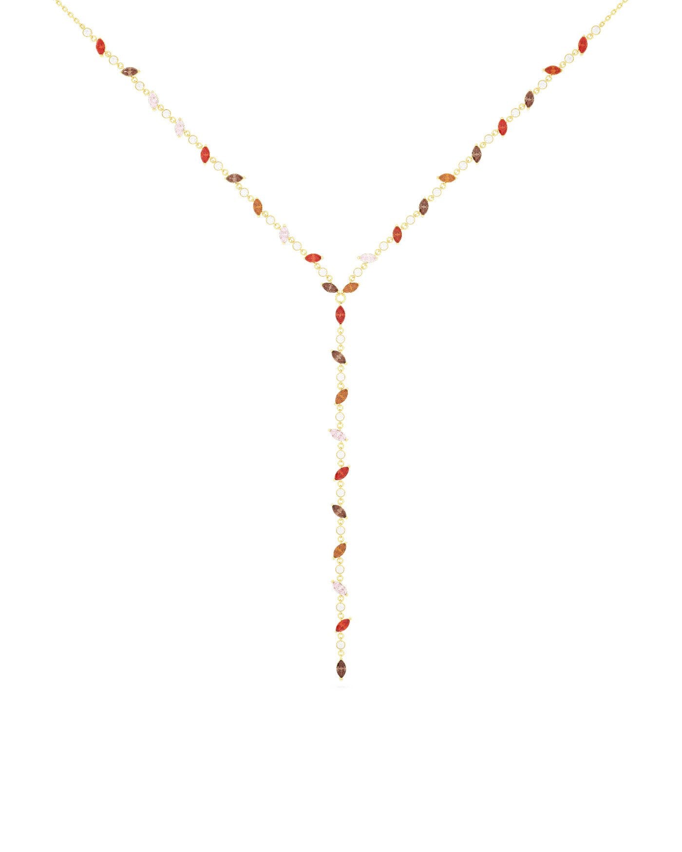 Questa collana interpreta il foliage dell’autunno in un intreccio elegante di pietre che, nei colori e nella forma, ricordano le foglie autunnali. Le pietre in zirconia cubica taglio marquise, si alternano a piccoli punti luce bianchi che ricordano riflessi di rugiada sulle chiome. Un gioiello apparentemente semplice che rivela carattere e grande attenzione al dettaglio.