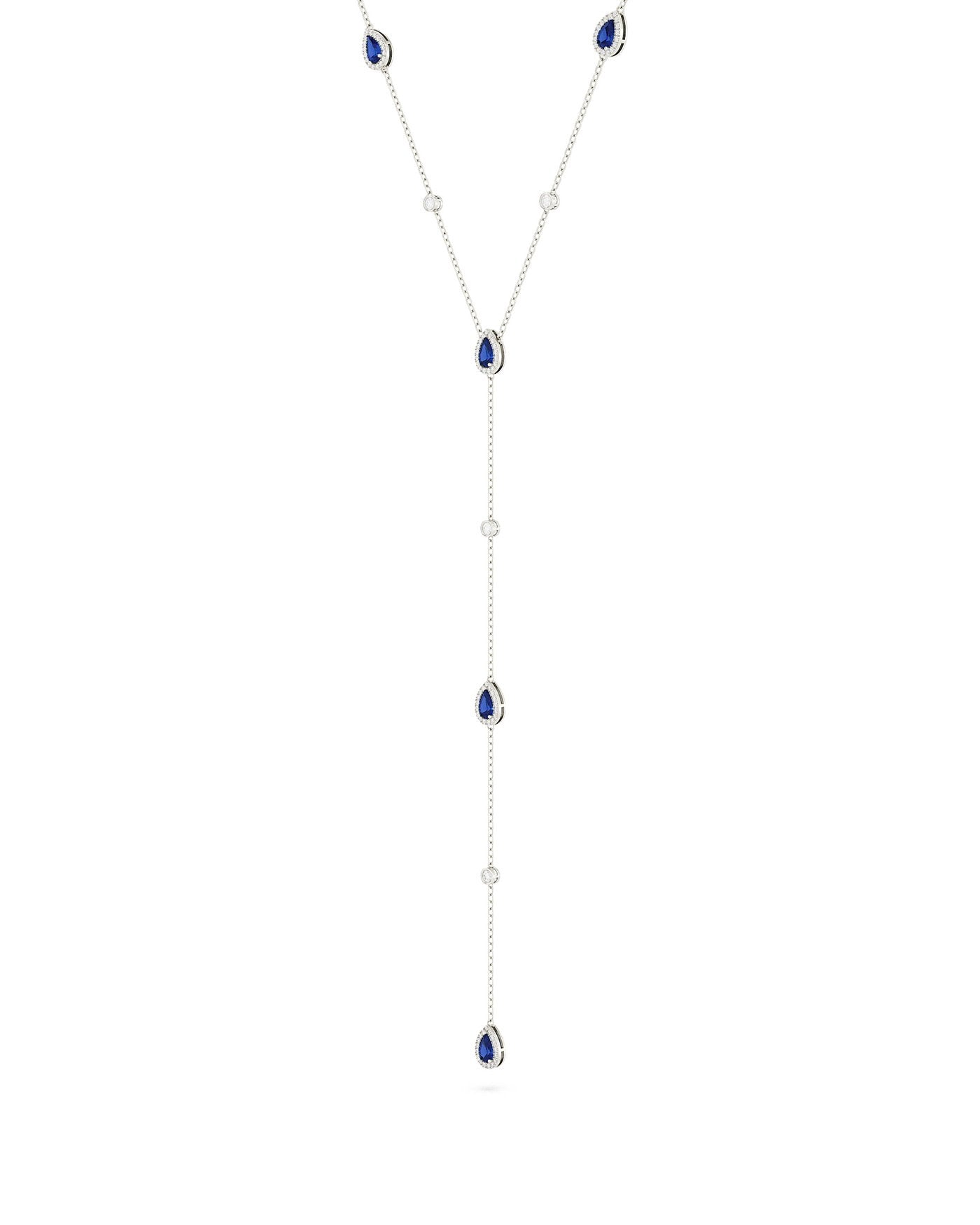 Una collana che cattura lo sguardo con il suo gioco di verticalità: le pietre blu a goccia, profonde e luminose, scivolano lungo la catena creando un disegno che allunga e valorizza il décolleté. La forma a Y regala movimento, diventando un elemento scenografico. Midnight è un gioiello che porta con sé il fascino delle serate più intense, pensato per chi ama brillare con sobria raffinatezza nelle occasioni speciali.
