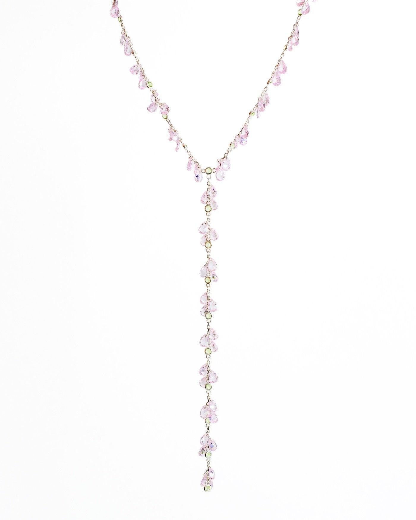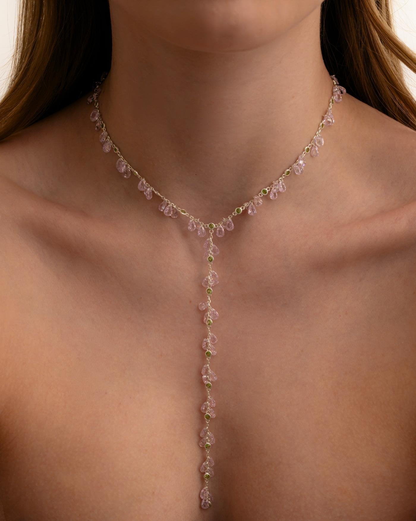 La Collana Rosè si distingue per la disposizione della zirconia cubica: le pietre a goccia, lasciate libere da incastonatura, creano un effetto morbido che amplificano la brillantezza lungo tutto il profilo. Le zirconie tonde verde pastello introducono un contrasto fresco e raffinato. La forma a Y esalta la verticalità del design, mentre il ciondolo-logo alla chiusura permette di indossarla anche con il pendente rivolto sulla schiena, trasformandola in un dettaglio versatile e scenografico. È un gioiello pensato per valorizzare scollature frontali o posteriori con un tocco elegante e contemporaneo.