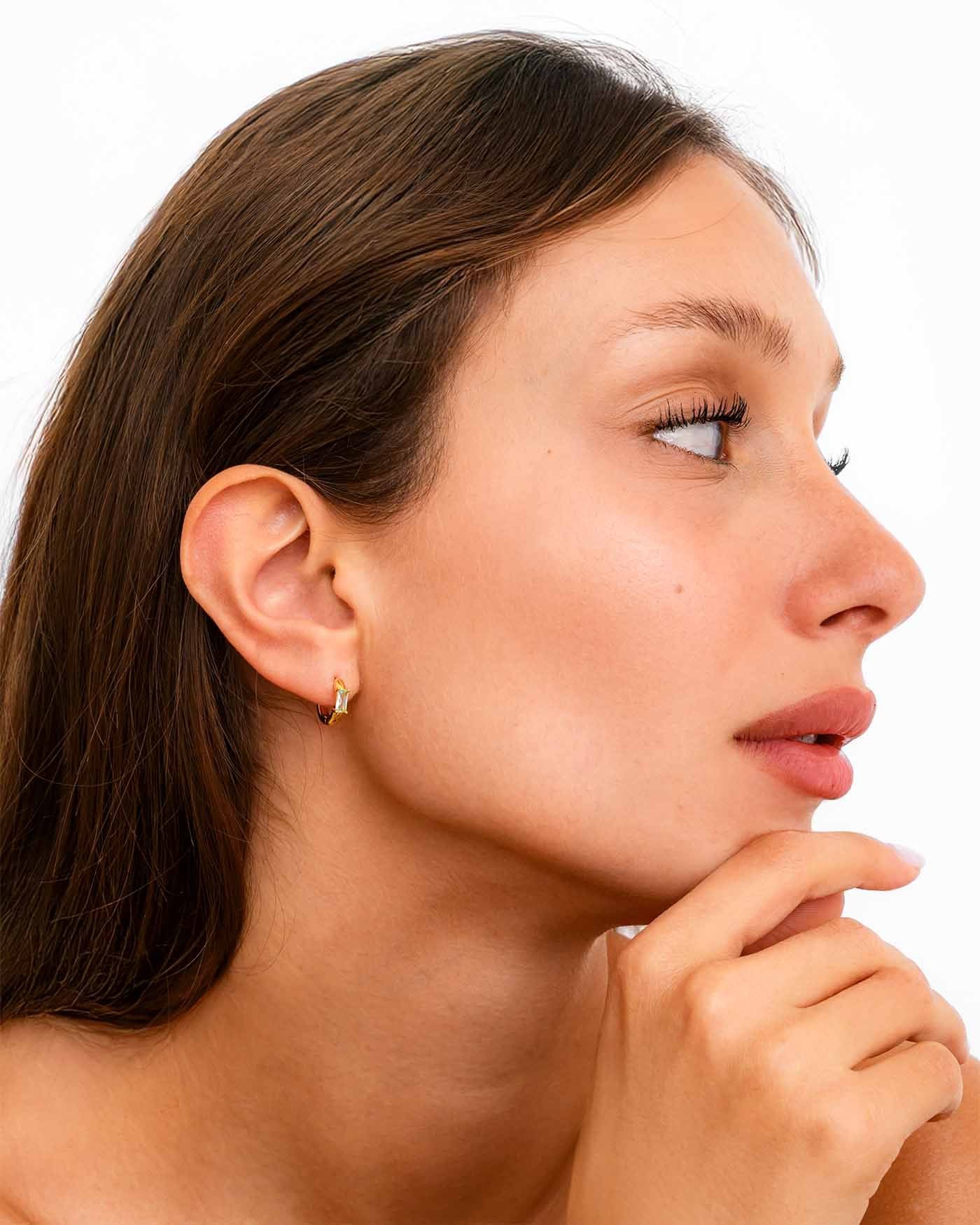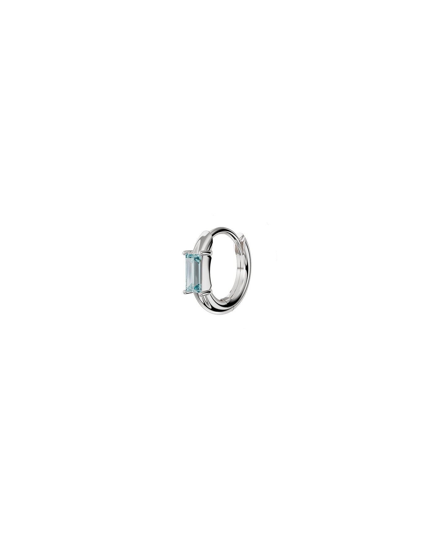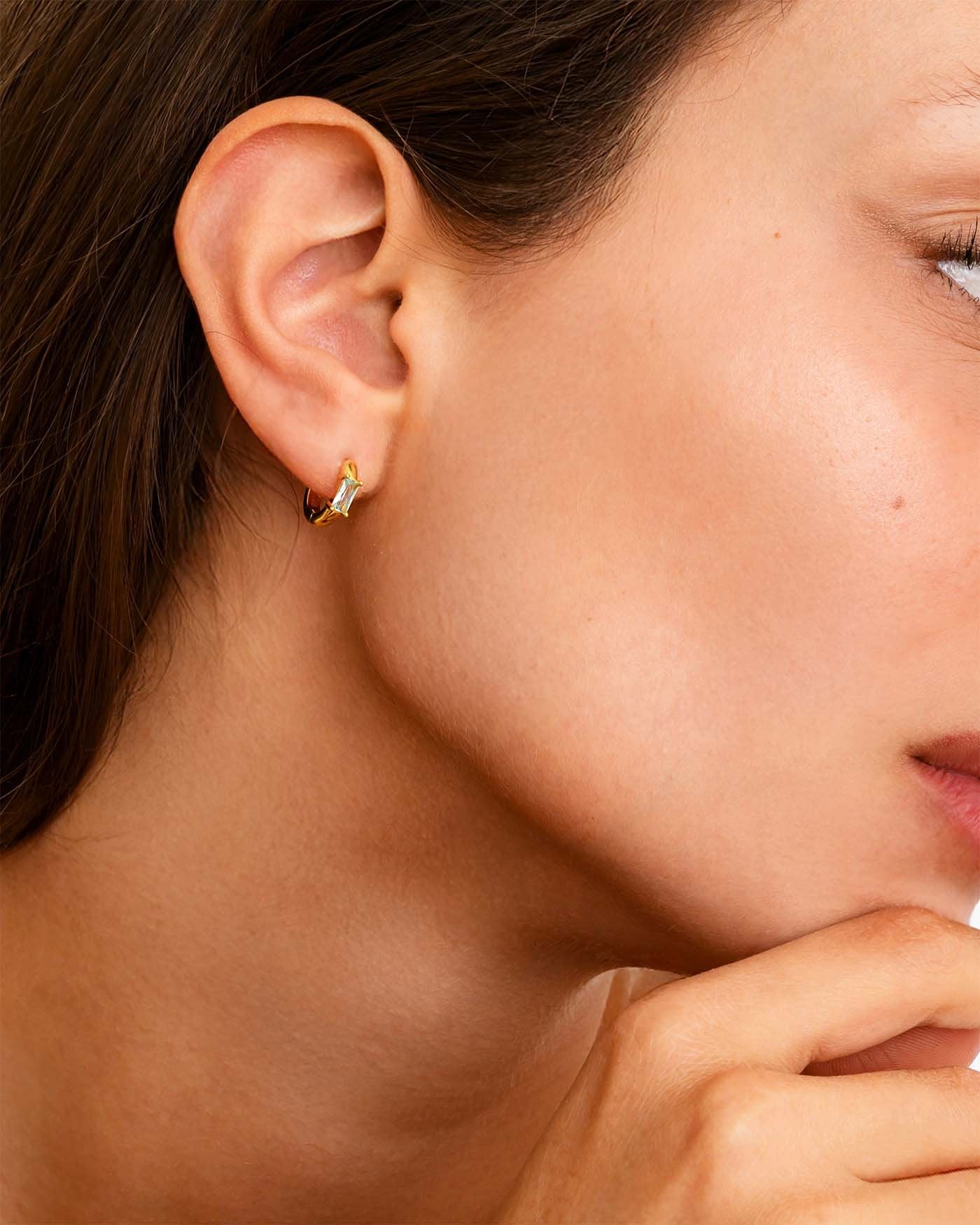 Un piccolo hoop dal design essenziale, impreziosito da una pietra taglio baguette dal riflesso ghiaccio. Perfetto da solo per un tocco luminoso e sofisticato, o in abbinamento ad altri orecchini per un look moderno e raffinato.