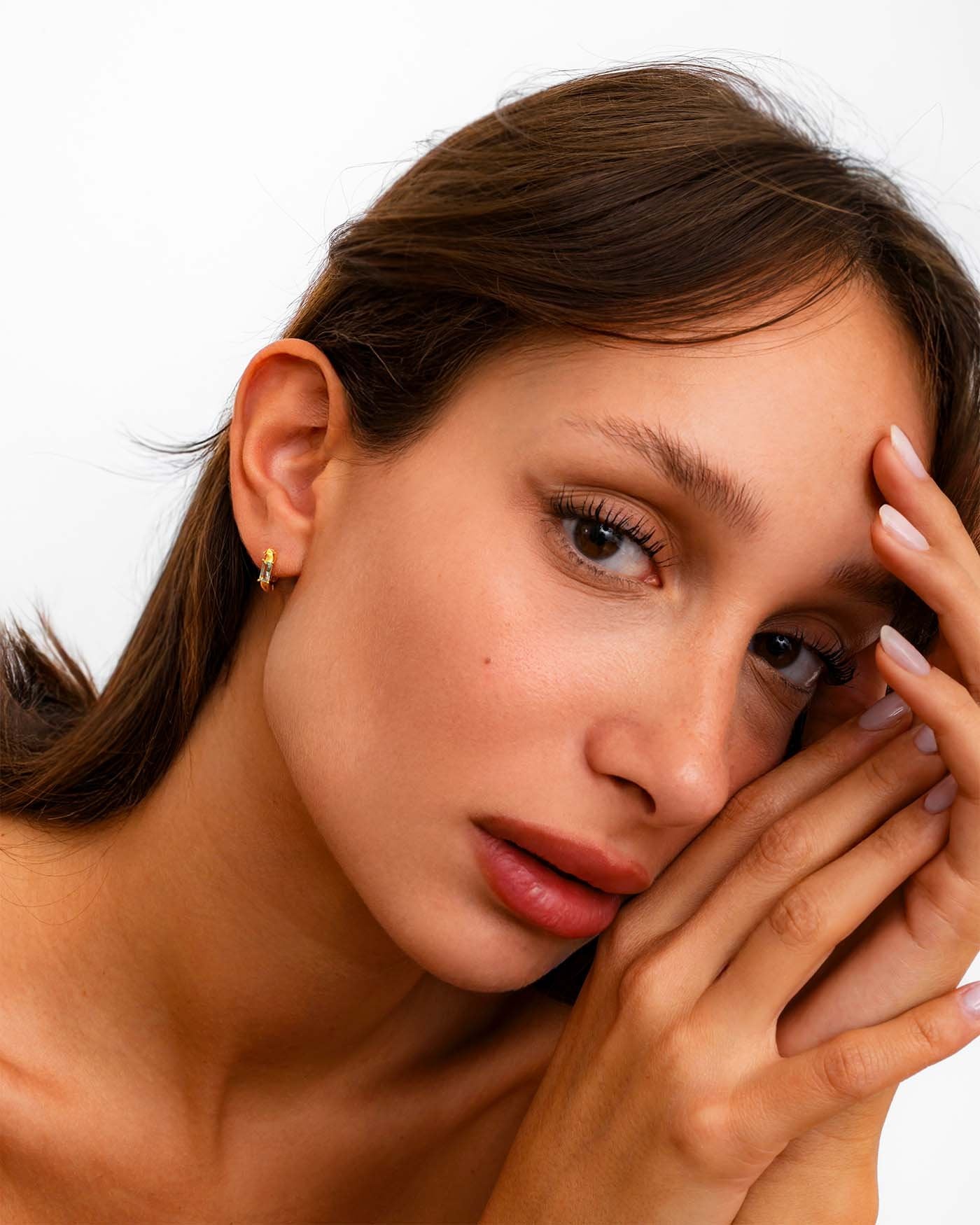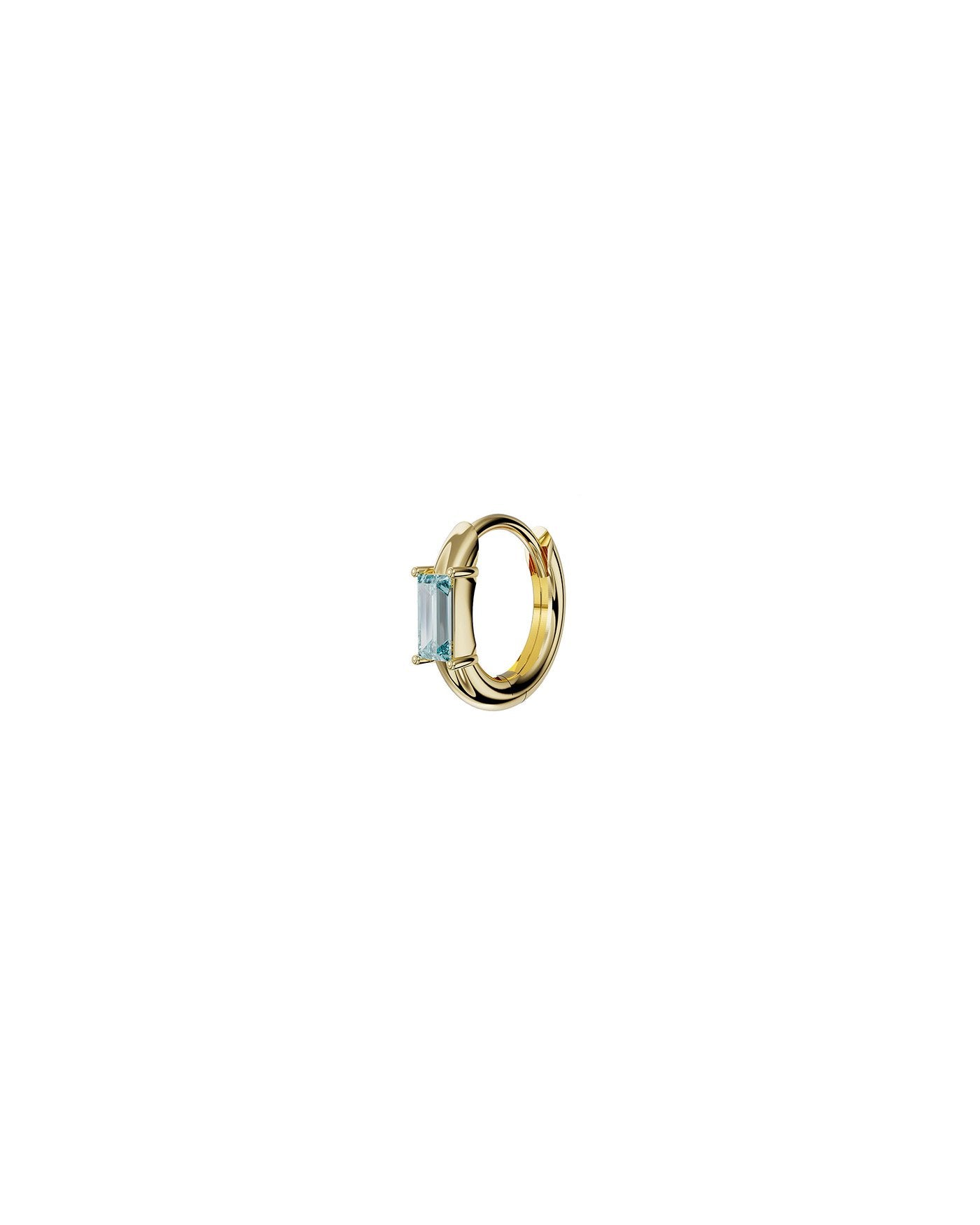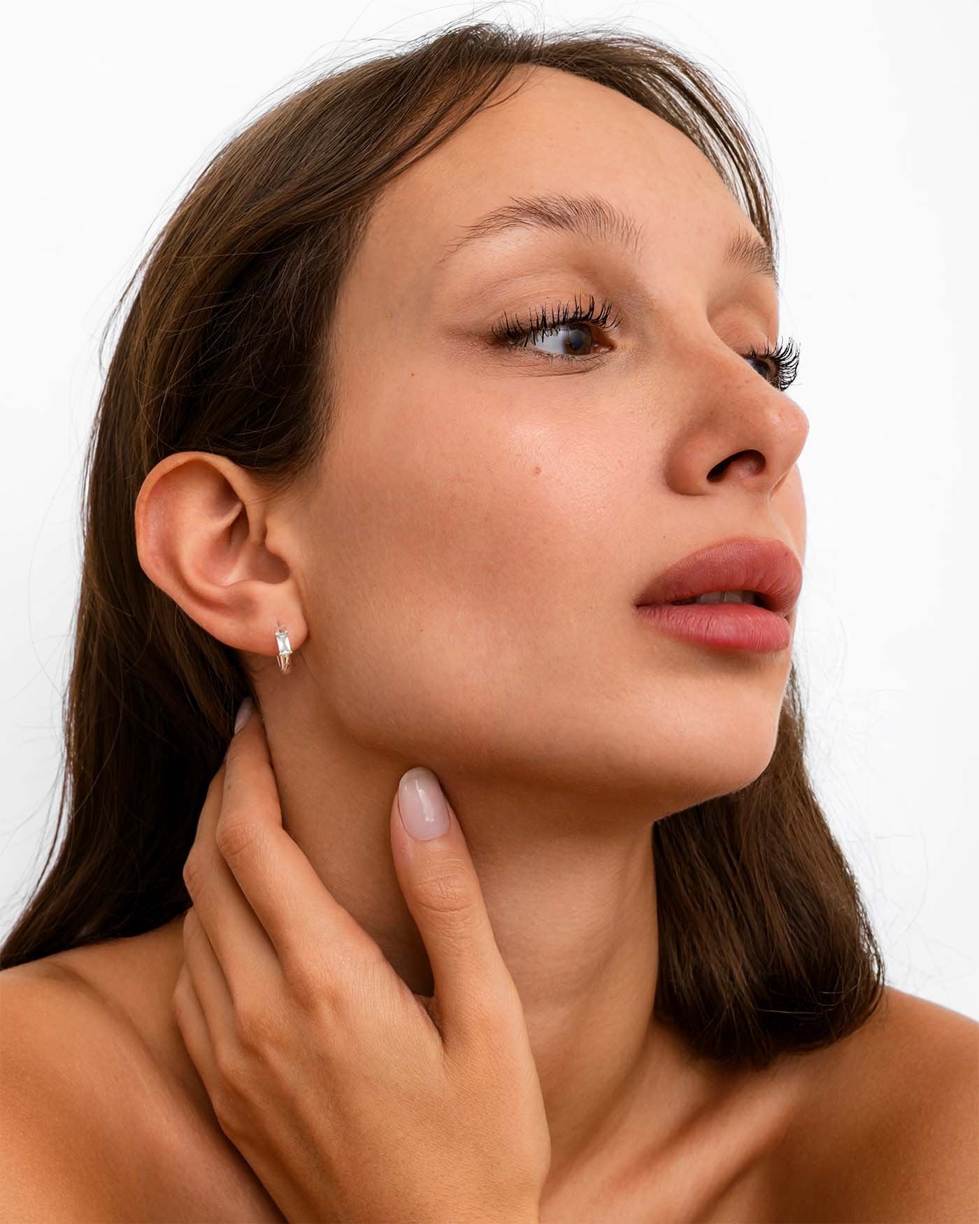 Un piccolo hoop dal design essenziale, impreziosito da una pietra taglio baguette dal riflesso ghiaccio. Perfetto da solo per un tocco luminoso e sofisticato, o in abbinamento ad altri orecchini per un look moderno e raffinato.