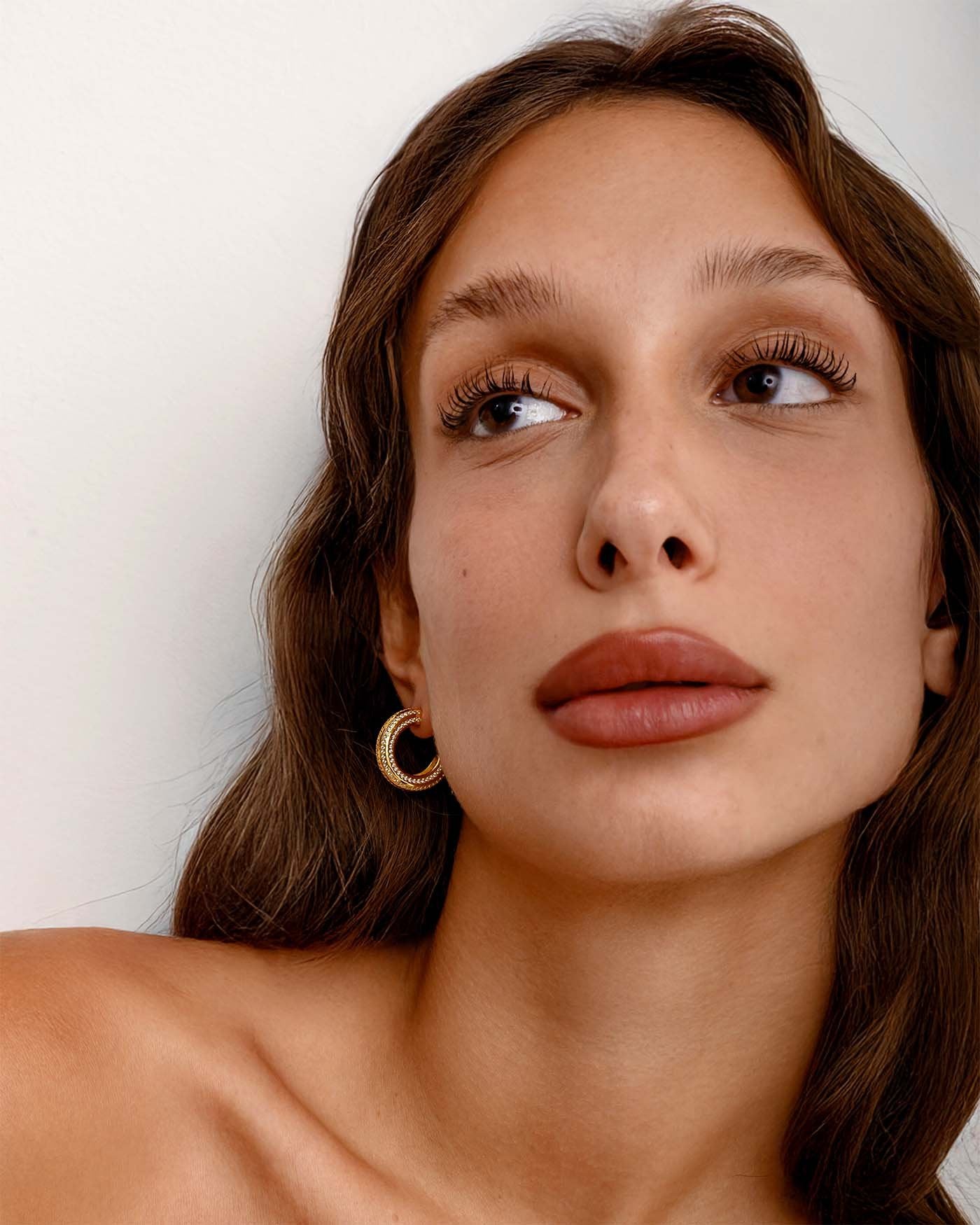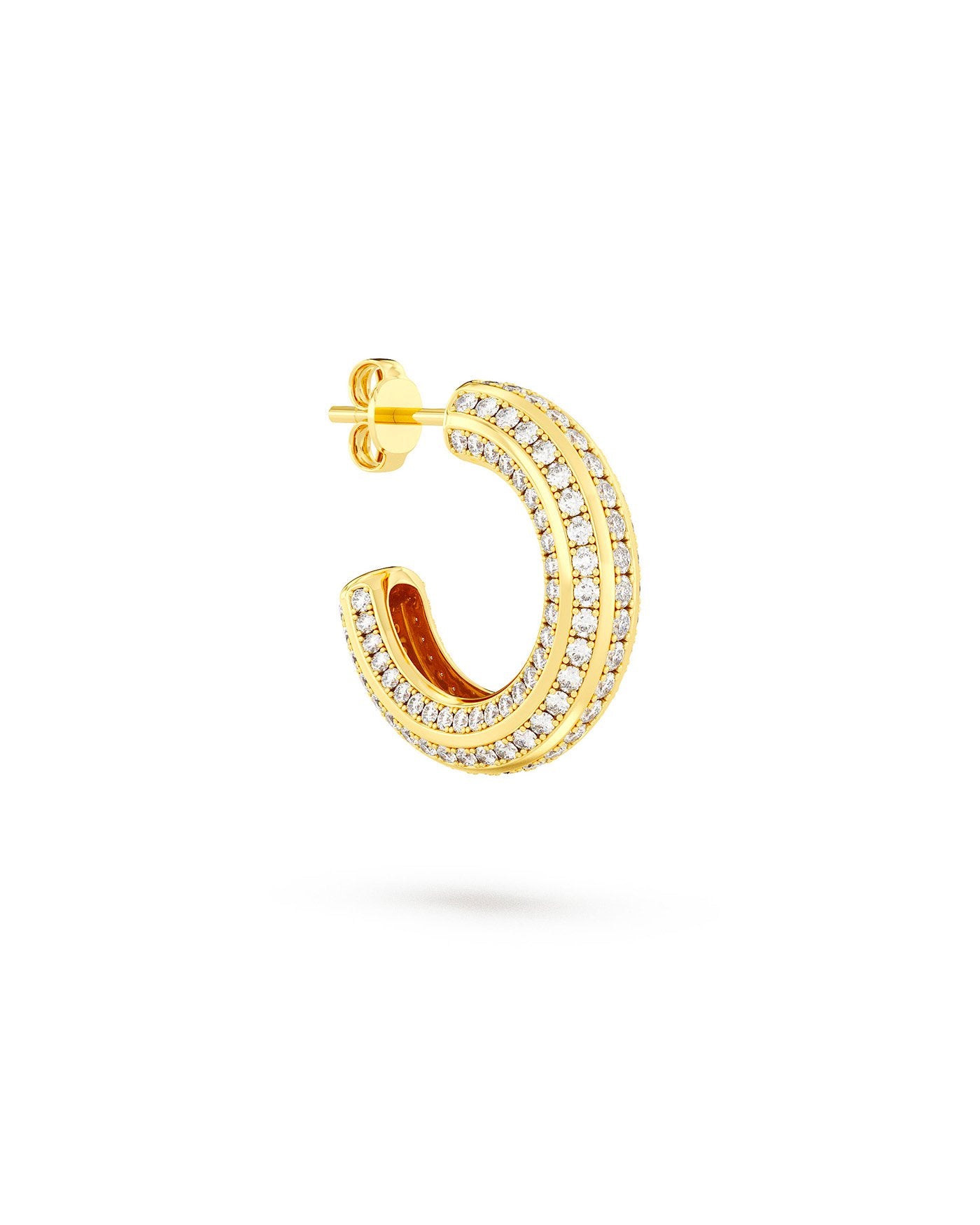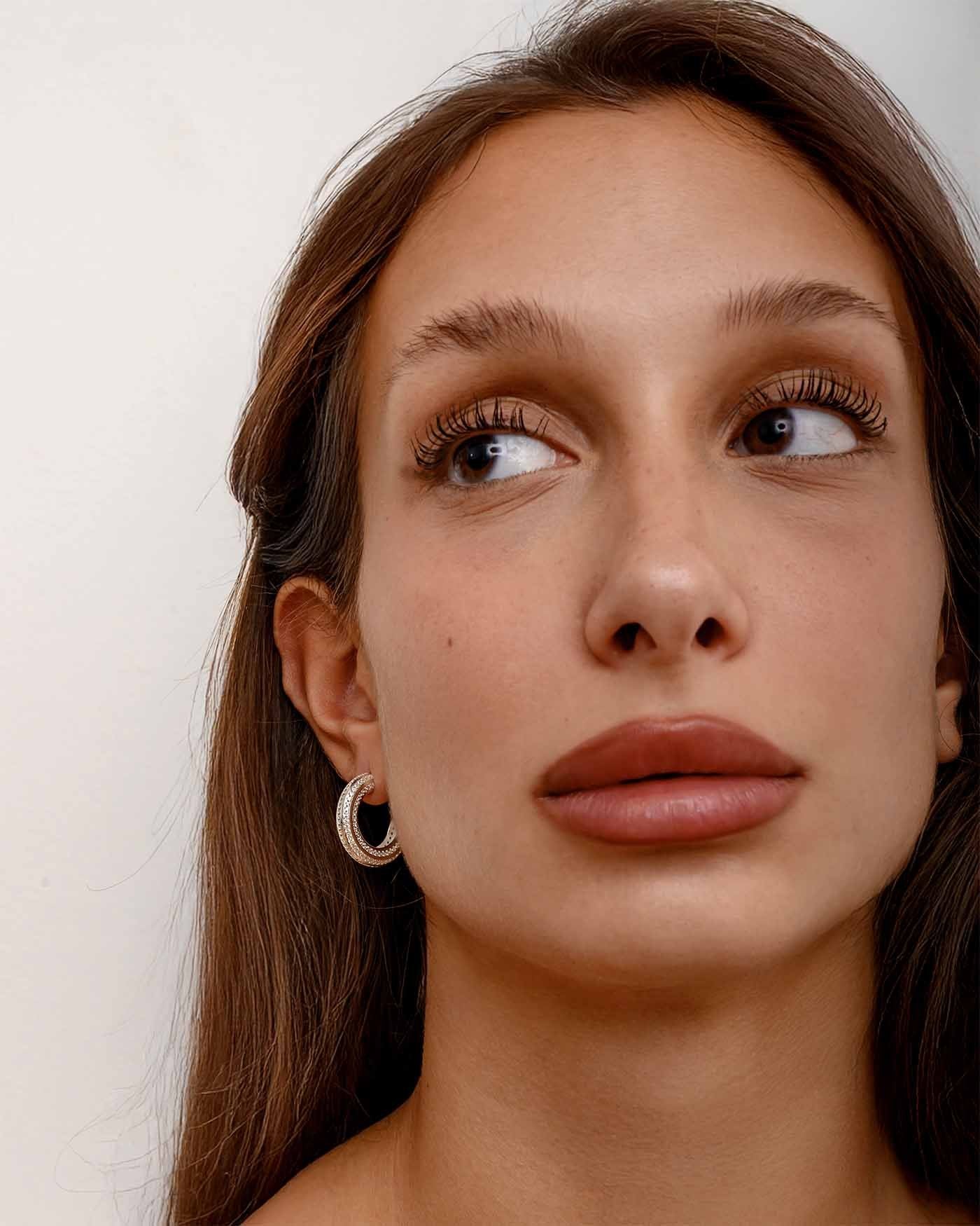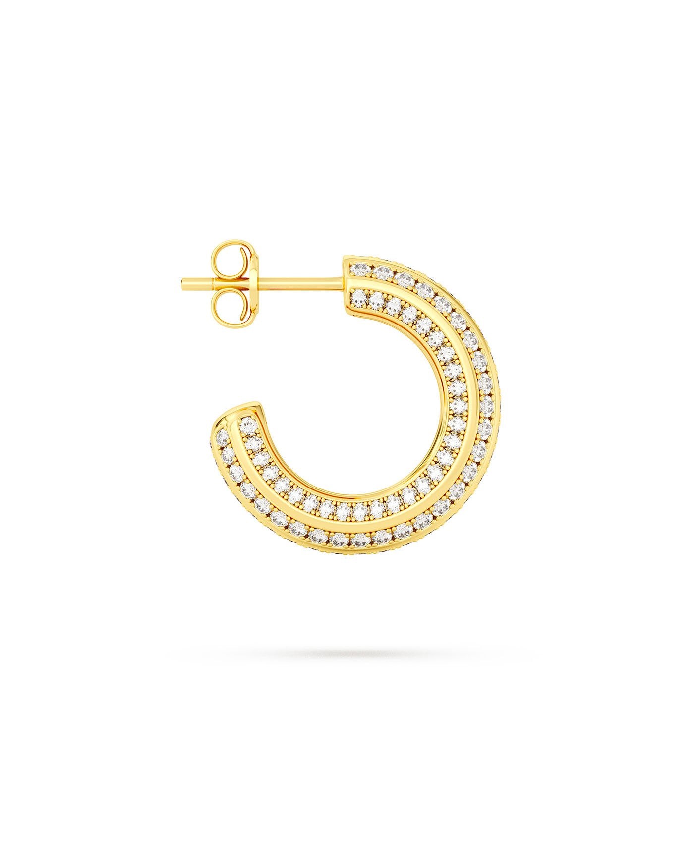 L’Hoop Stripe è una versione più luminosa del classico cerchio. Le linee parallele di punti luminosi, che percorrono tutta la superficie, creano un ritmo grafico ed elegante, donando al design più carattere. Stripe è pensato per chi ama i piccoli dettagli, quelli che non si notano facilmente ma che fanno la differenza in un look.
