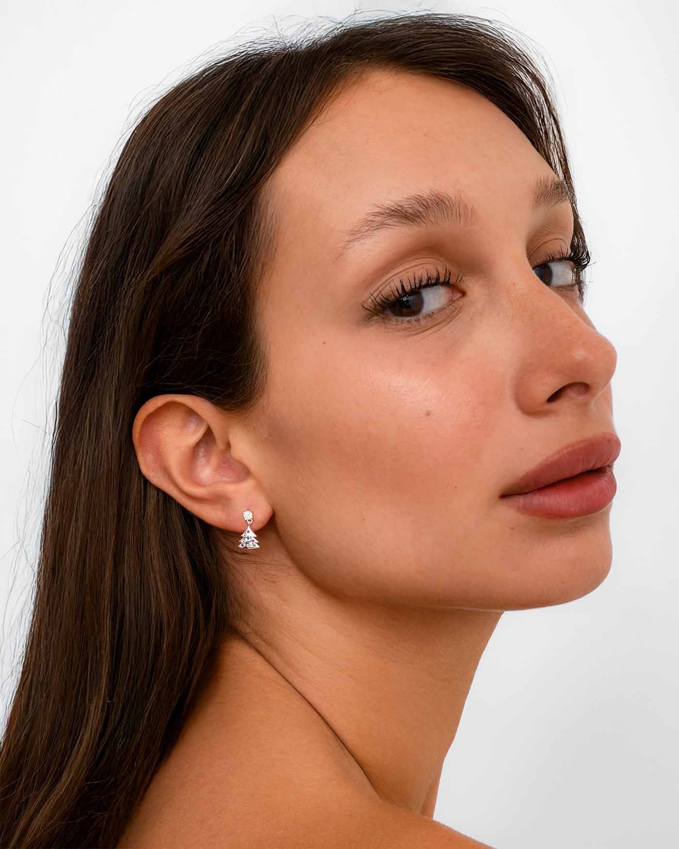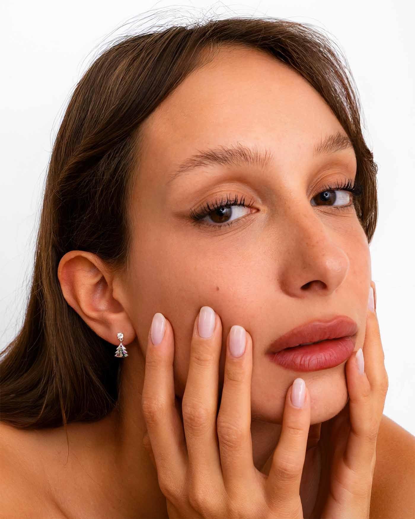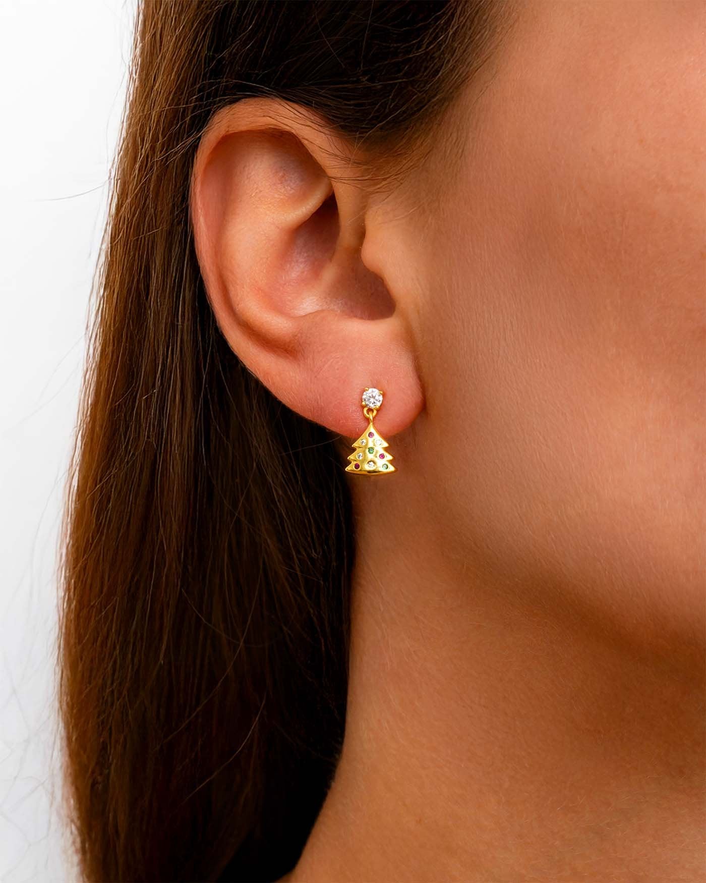 Un punto luce scintillante che regge un delicato ciondolo a forma di albero di Natale, decorato con piccole pietre colorate. Un gioiello festivo e luminoso, perfetto per aggiungere un tocco di magia alle feste.