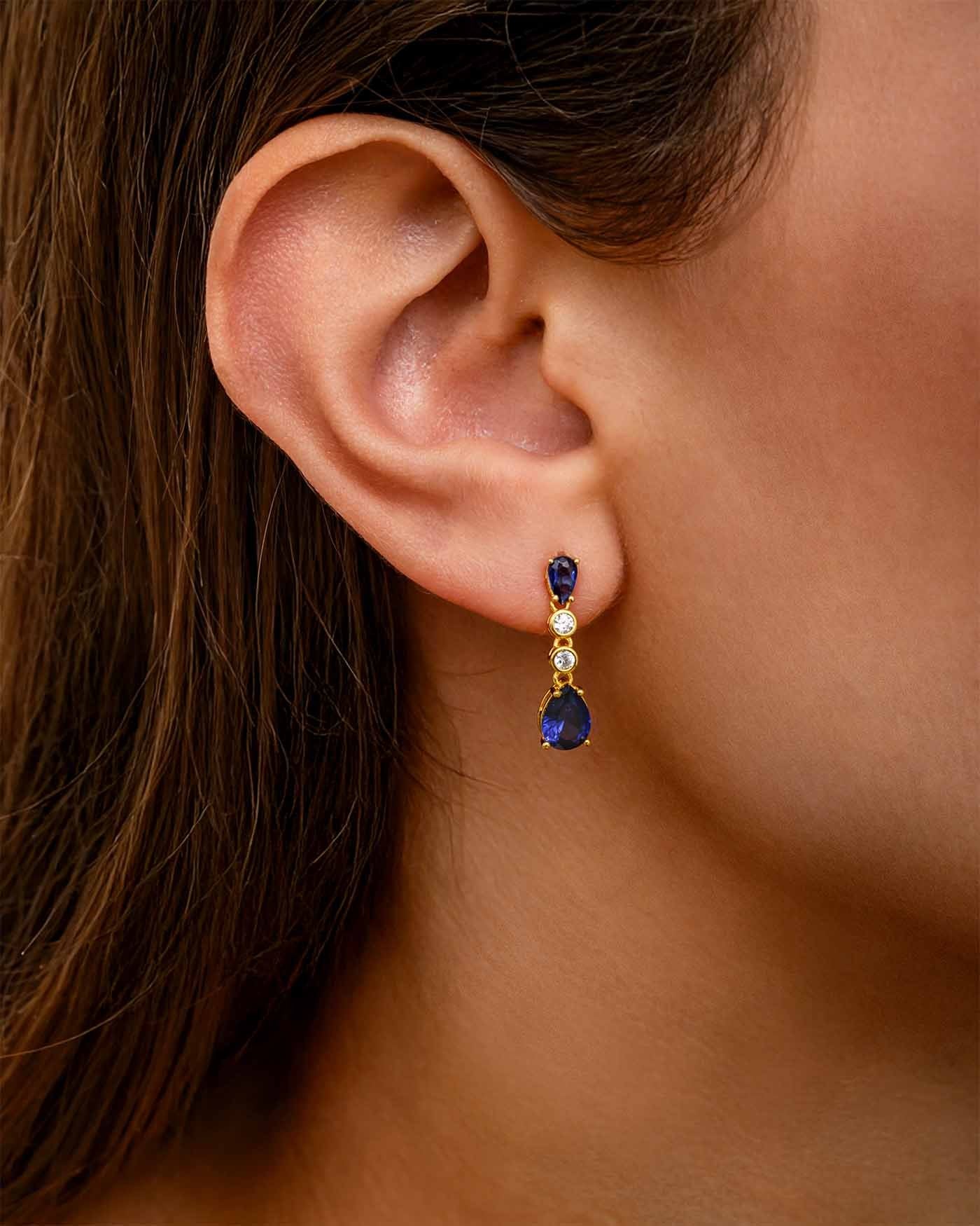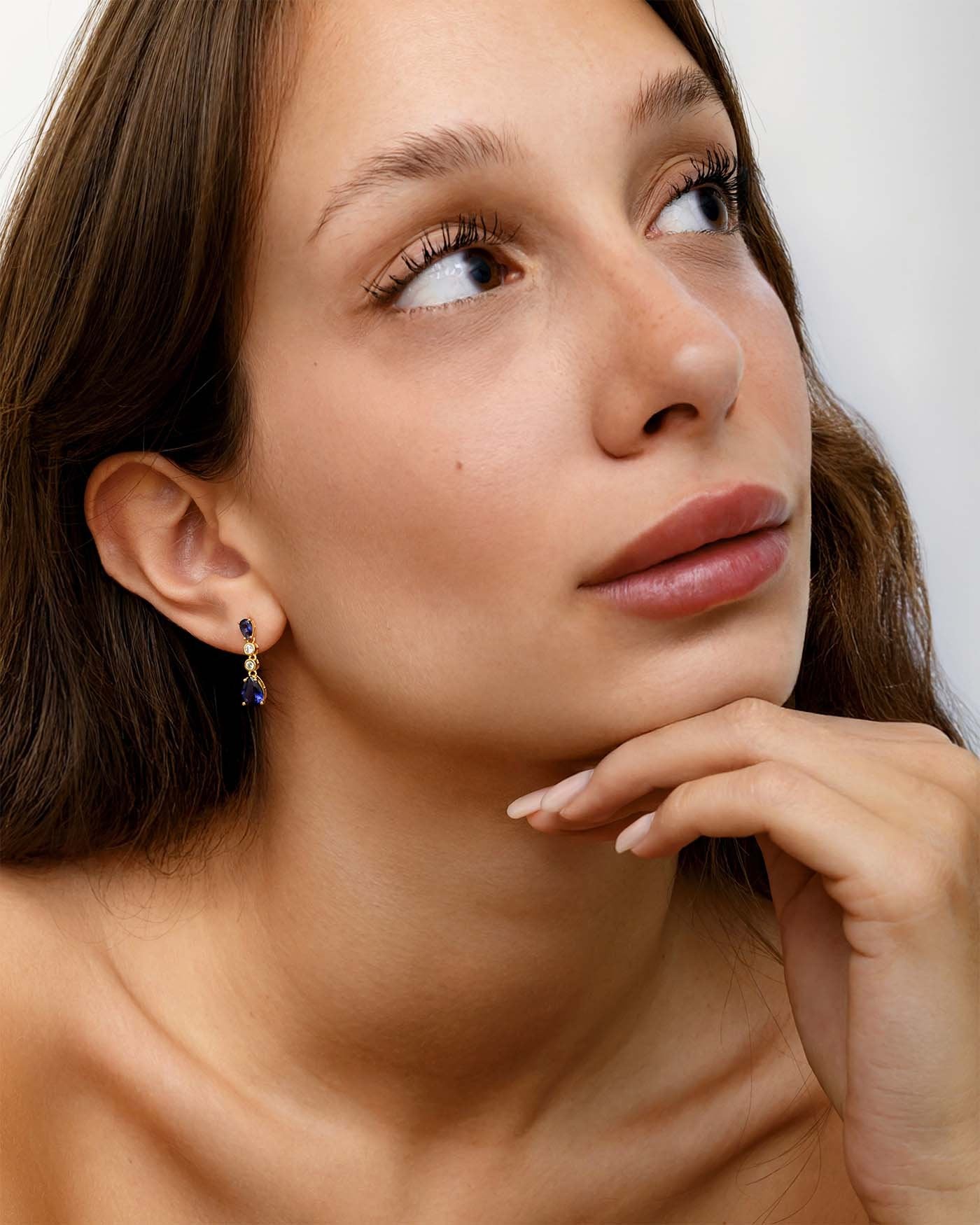 L’Orecchino Cold racconta la bellezza essenziale dell’inverno. Due gocce blu intenso, unite da piccoli punti luminosi, evocano la magia delle notti invernali. Può essere indossato al lobo o anche in altri piercing per creare un abbinamento più pieno e personale.