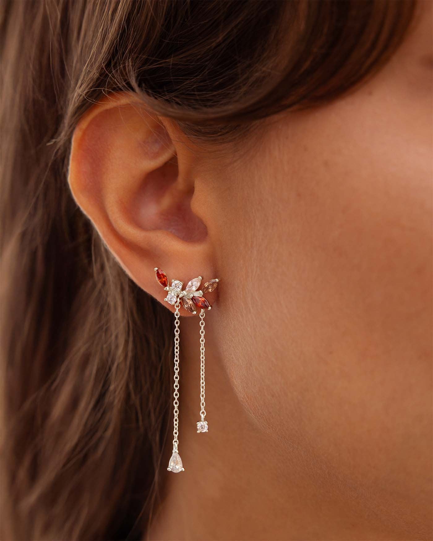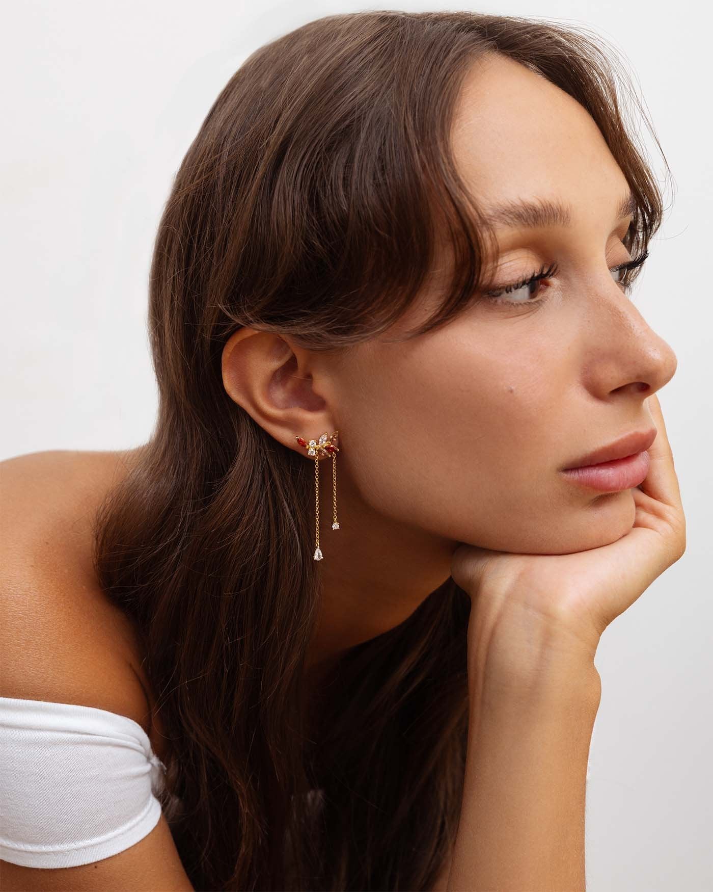 L’Orecchino Foliage presenta un design estremamente caratteristico. La parte superiore riprende la forma di un ramo, arricchito da pietre dal taglio marquise che, con le loro sfumature, evocano piccole foglie che cambiano colore con la stagione.