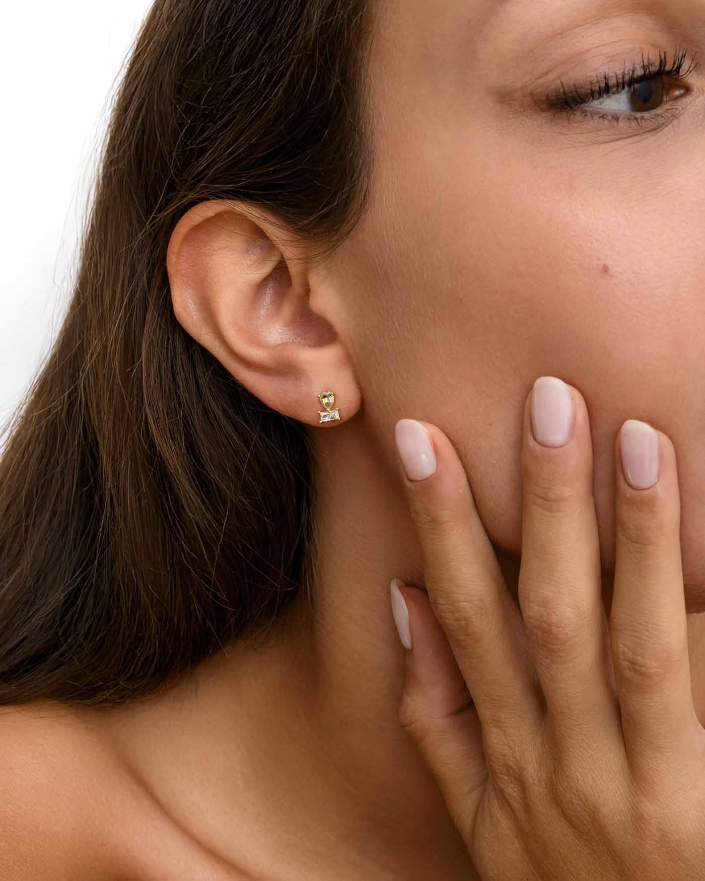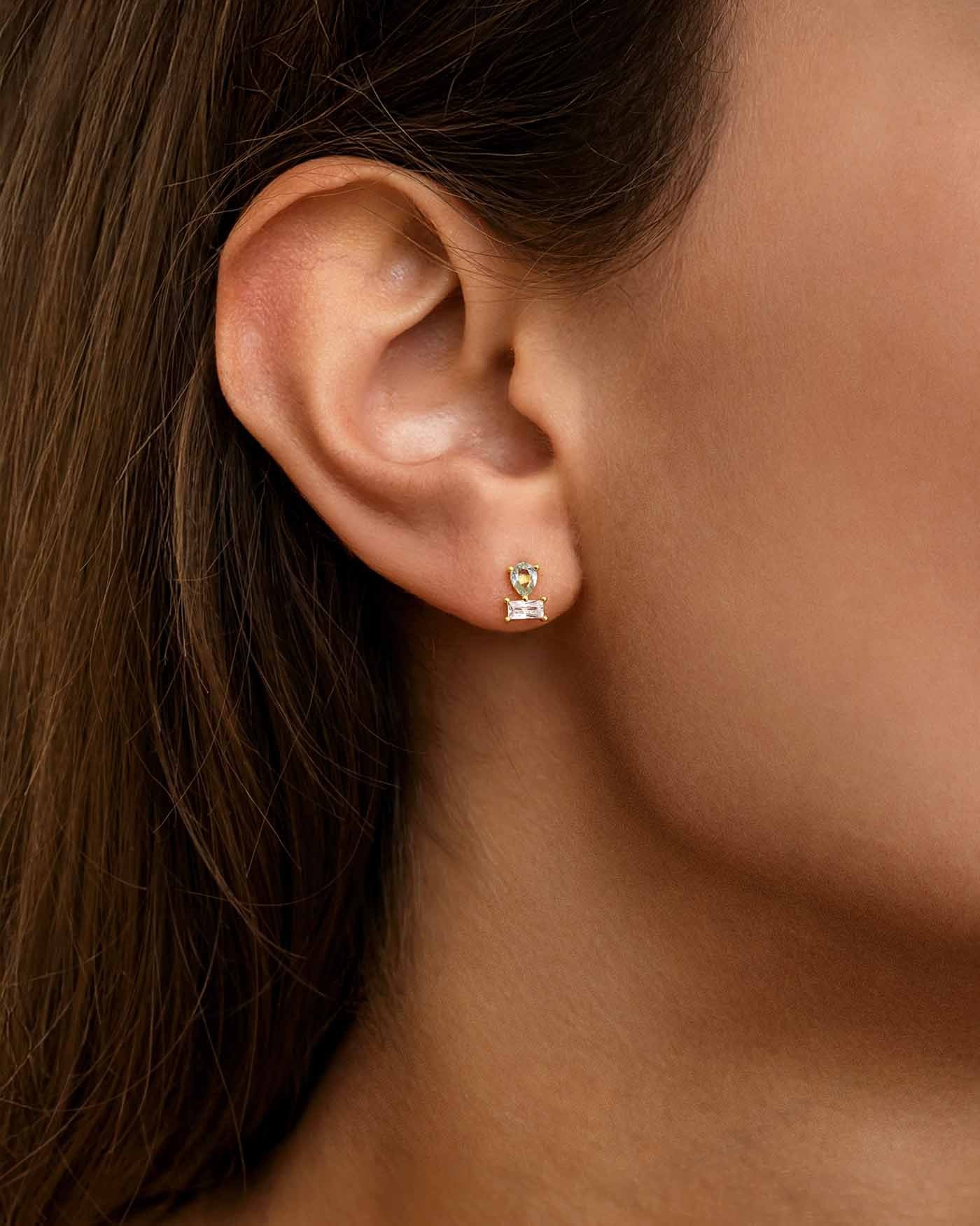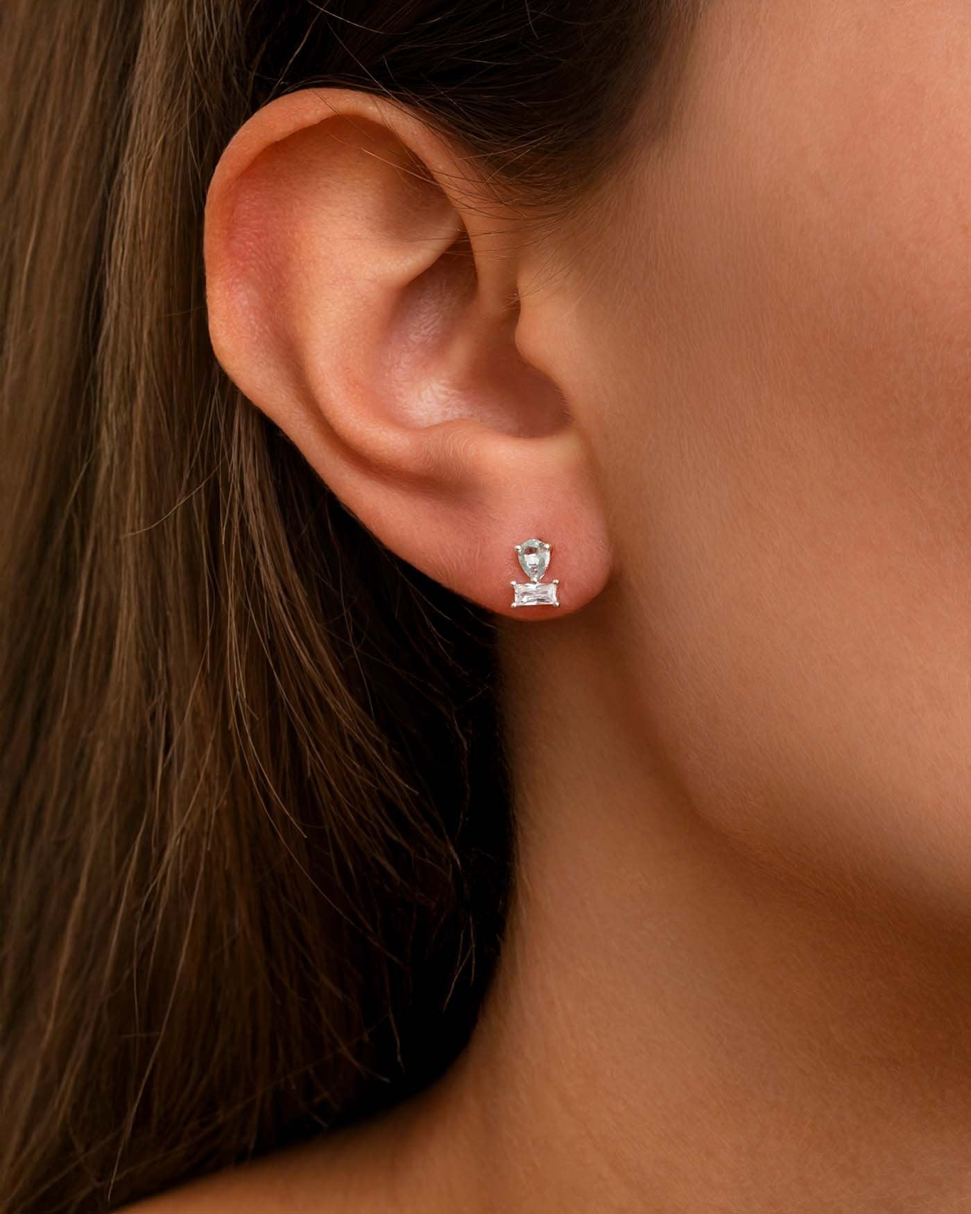 Un design elegante e luminoso che unisce due pietre: una baguette bianca e una goccia dal riflesso ghiaccio. Un equilibrio perfetto tra forme e luce, pensato per chi ama dettagli raffinati e moderni.