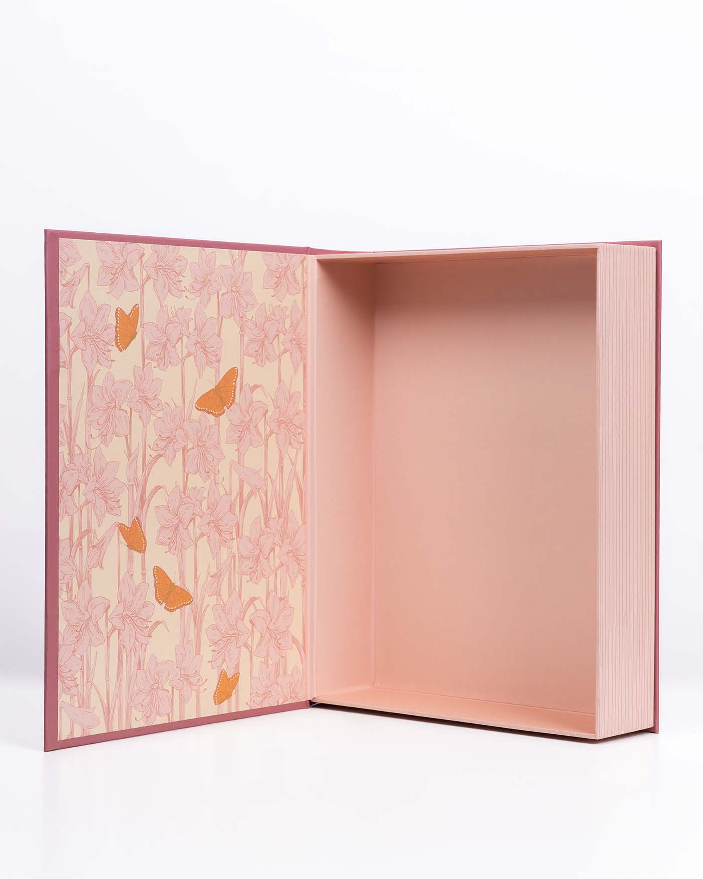 La nostra iconica Scatola Libro è un raffinato cofanetto a forma di libro. Ogni edizione è impreziosita da illustrazioni originali, che si rinnovano a ogni nuova collezione, rendendo ogni pezzo unico. La Scatola Amaryllis, edizione speciale della collezione autunnale, celebra la stagione con dettagli curati che racchiudono tutta la magia dell’autunno.
